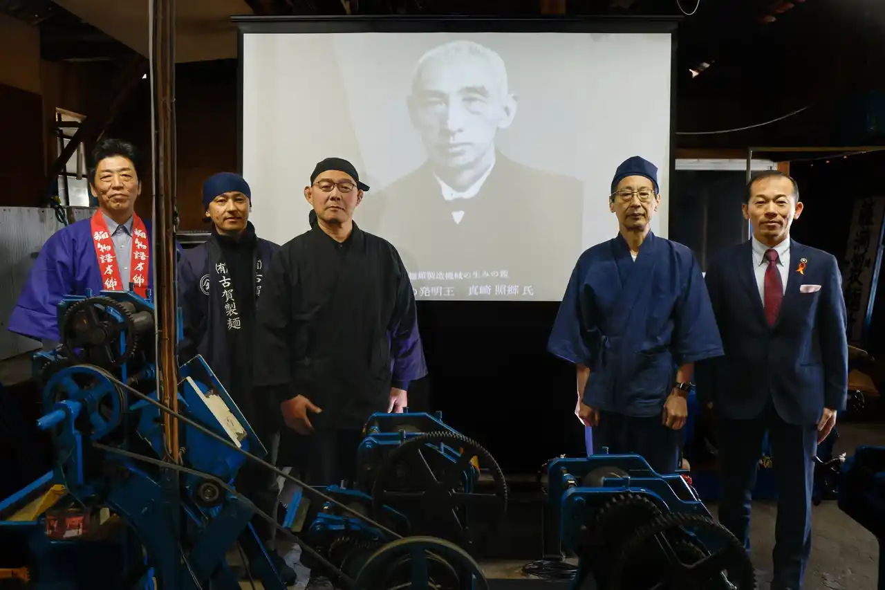 佐賀県の発明家・真崎照郷氏の写真と、現存する真崎式製麺機の前で未来に向けた決意を誓う |