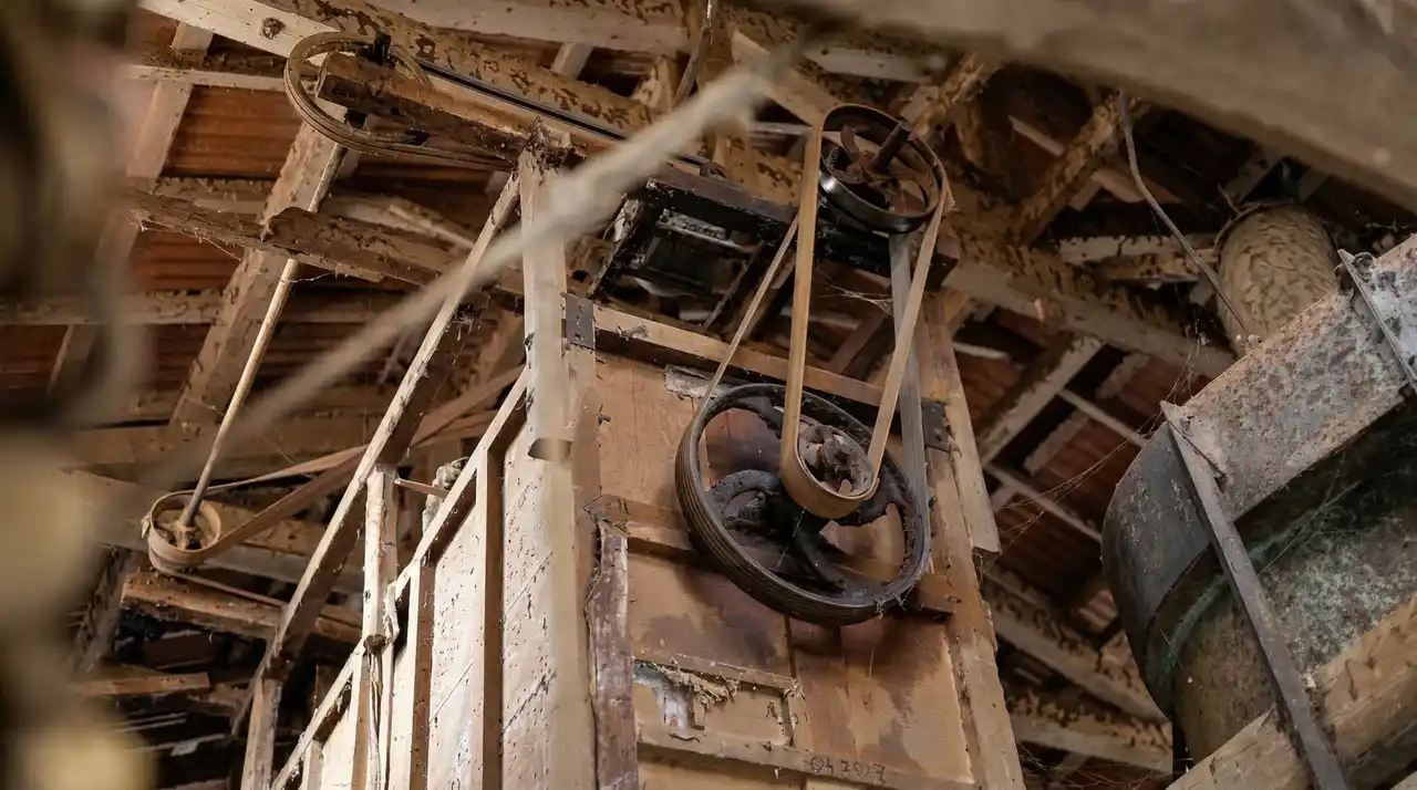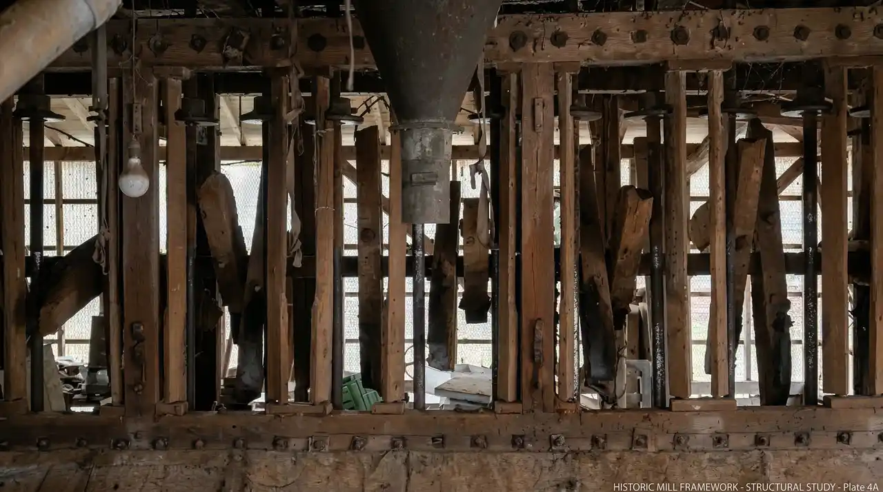この工房では、電動の機械ではなく、水車の動力だけを使って原料を挽いています。水車製粉は、現代の高速回転する電動製粉機に比べて大量生産には向きませんが、低速・低温で挽くことで素材が熱で変質せず、木本来の香りを損なわずに仕上げることができます。 |
