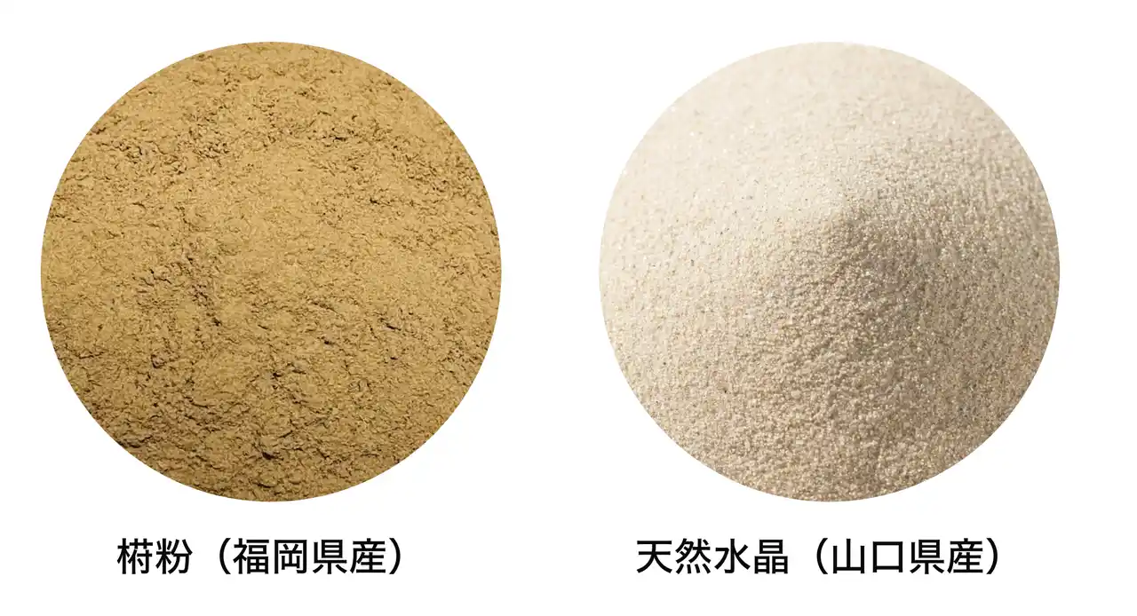原材料:タブ粉(福岡県産)、杉粉(福岡県産)、水晶パウダー(山口県産) |