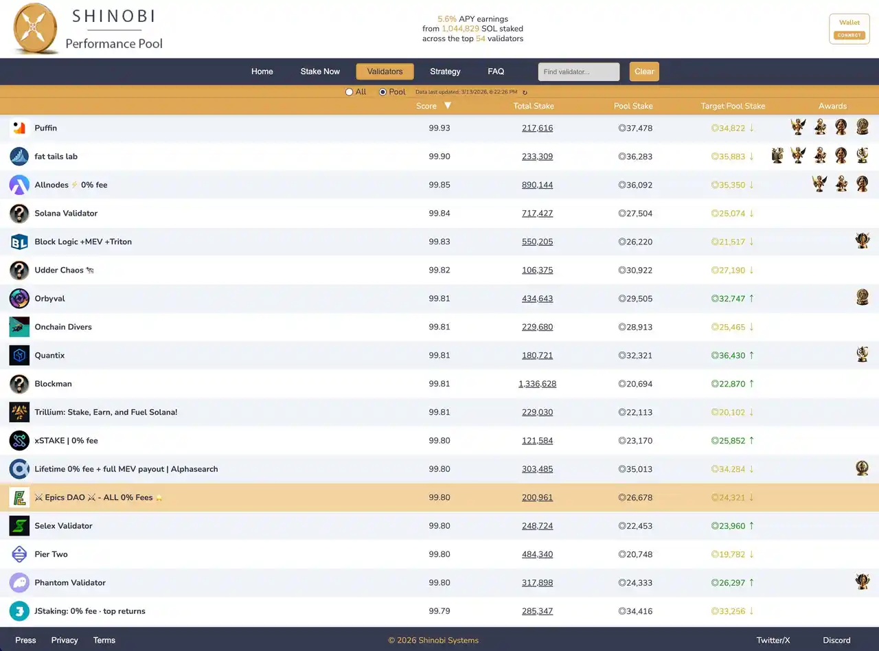 あわせて、Solana ステーキングプール「Shinobi Performance Pool」において、Epics DAO バリデータが順位を約 80 位上昇させ、TOP20 入りを達成しました。現在 12~14 位帯を推移しており、次の目標として TOP10、そして TOP3、最終的にはトップを目指して日々改善を続けています。 |