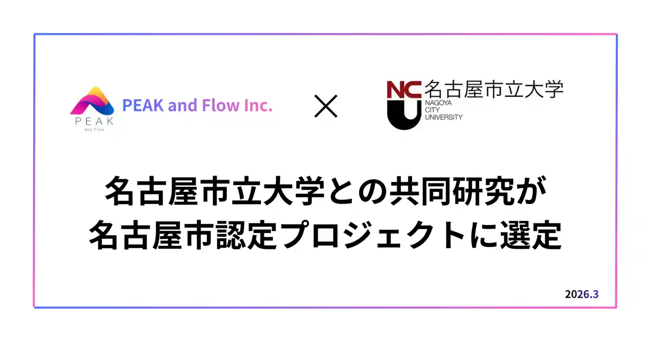 株式会社PEAK and Flow(本社:愛知県名古屋市、代表取締役CEO:片山真由子)は、名古屋市立大学との共同研究「職場における行動変化を起点とした心理状態推移の実証的研究」が、名古屋市の研究開発型イノベーション創出支援事業「NAGOYA RESEARCH BRIDGE」において、新規性を有する連携プロジェクトとして認定されたことをお知らせします。 |