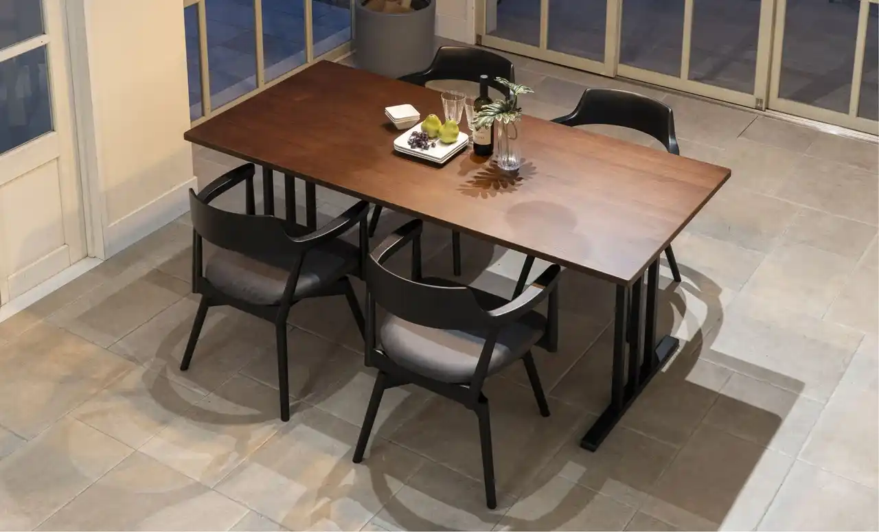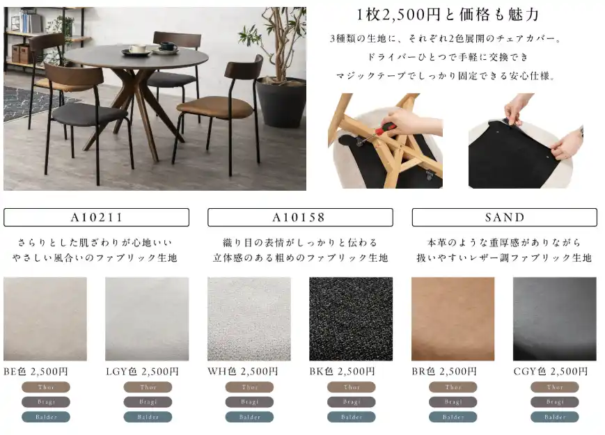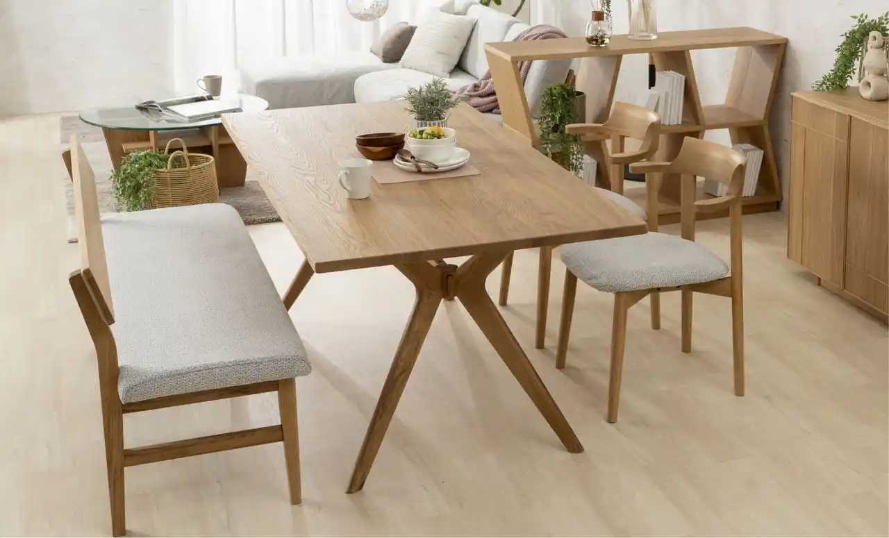 オーク突板の豊かな木目が映える「Thor」。 脚は、すっきりとしたテーパー脚、存在感のあるX脚、軽やかな印象のスリット脚の3タイプ。 選ぶ脚で、ダイニングの雰囲気が変わる。 |