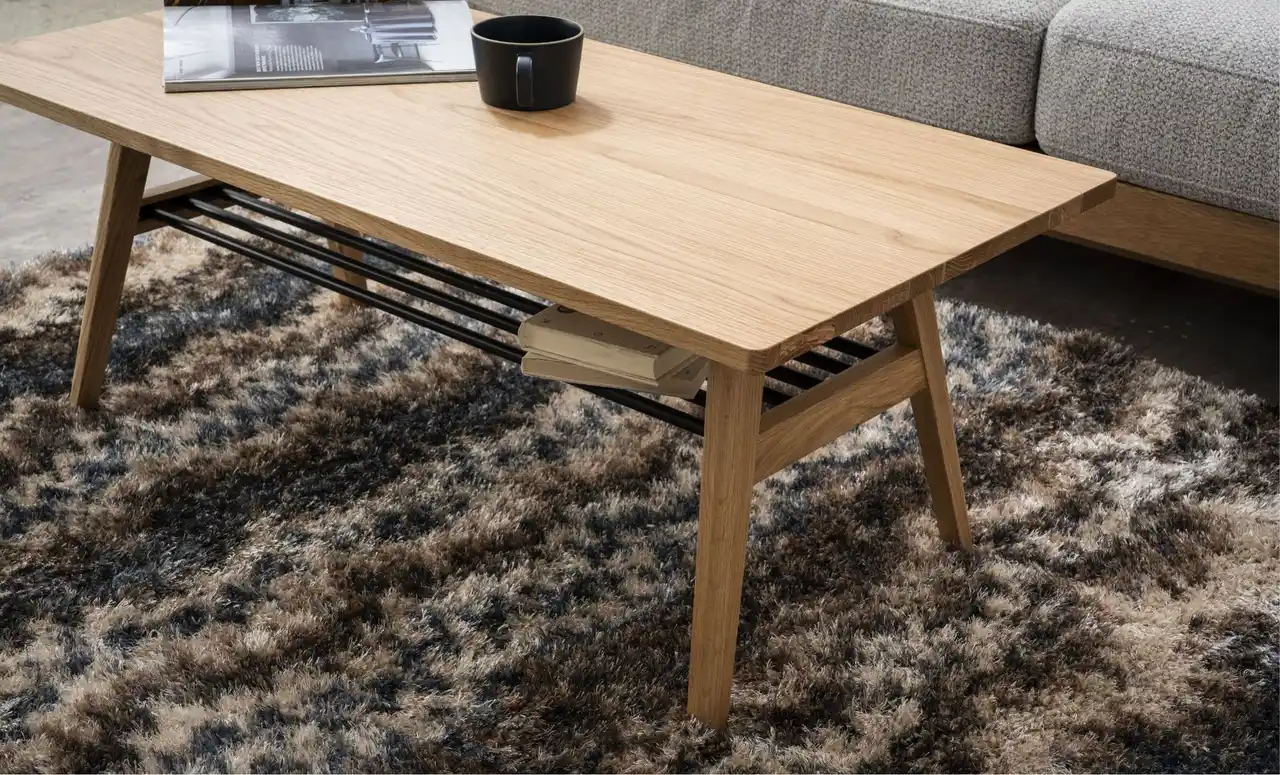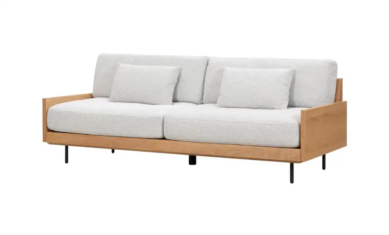 ホワイトオーク材の木フレームがアクセントとなったデザイン。背面まで使える収納スペースを設けることで実用性を高め、細身の黒スチール脚が軽やかな存在感をつくり、角には面取り加工を施し全体をやわらかな印象に整えた。 |