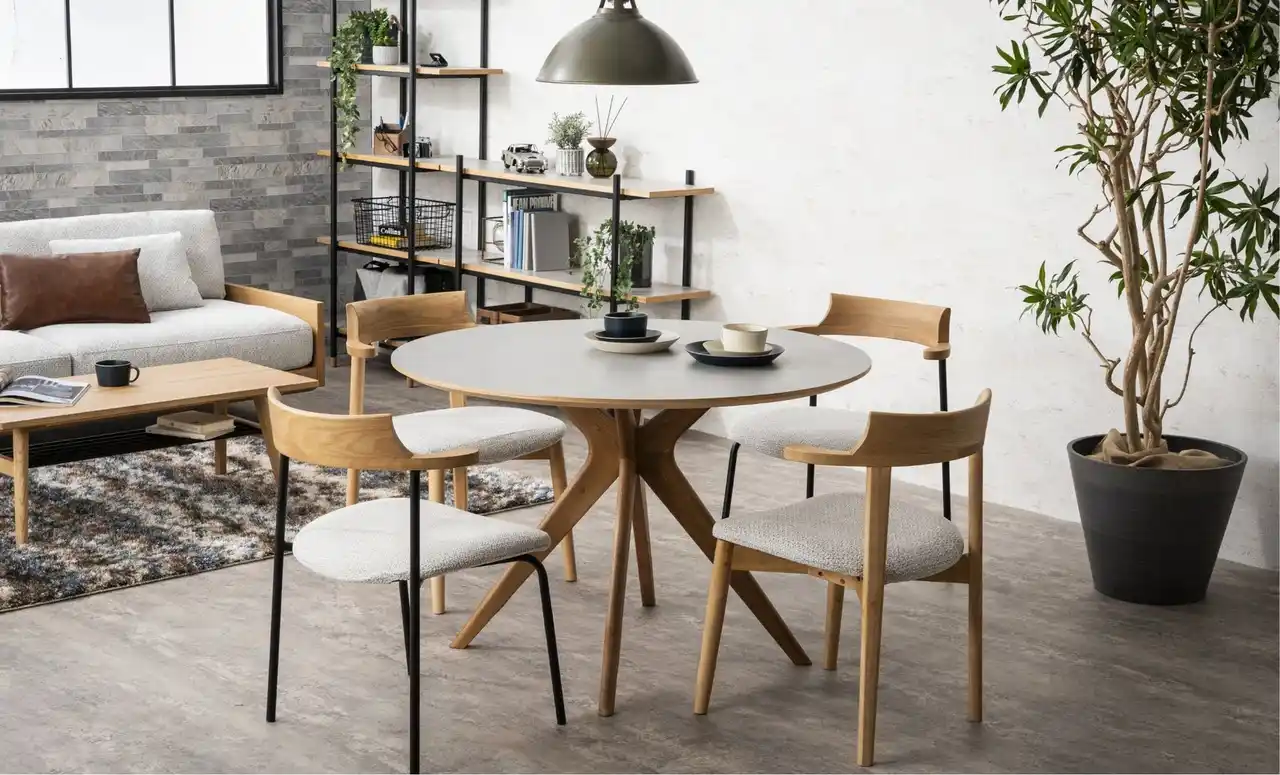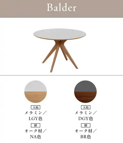 110cmのラウンドテーブル「Balder」。 丸みのあるフォルムが空間にやわらかな印象をもたらし、自然と会話が生まれる。 天板にはメラミン材を使用し、傷や汚れに強く、日常使いしやすい設計。58,000円(税込)