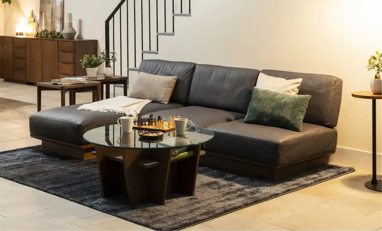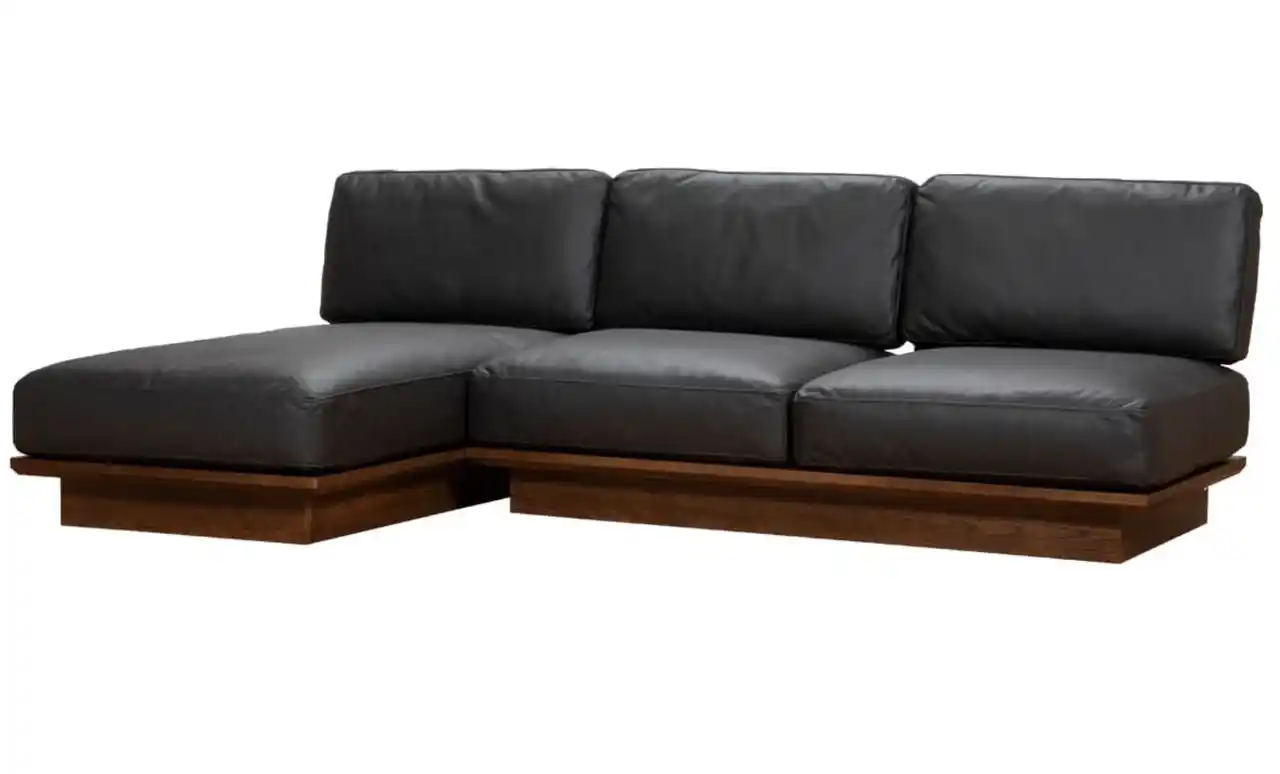 2Pとシェーズを組み合わせて、ゆったりとくつろげるカウチスタイルに。 足を伸ばしてくつろげる広々としたソファは 脚のないロータイプだから、空間に圧迫感を与えず、重厚感をもたらす。 |