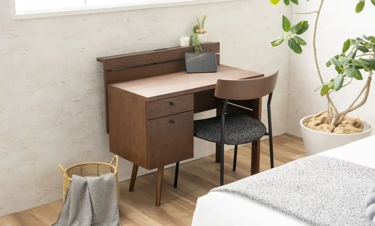 幅90cm、奥行き40cmのコンパクト設計で取り入れやすいBragiのデスク。 ベッドやナイトテーブルと並べれば、寝室に統一感のある空間をつくれる。 単体でも使いやすく、ワークスペースやドレッサーとしても活躍する一台。 |