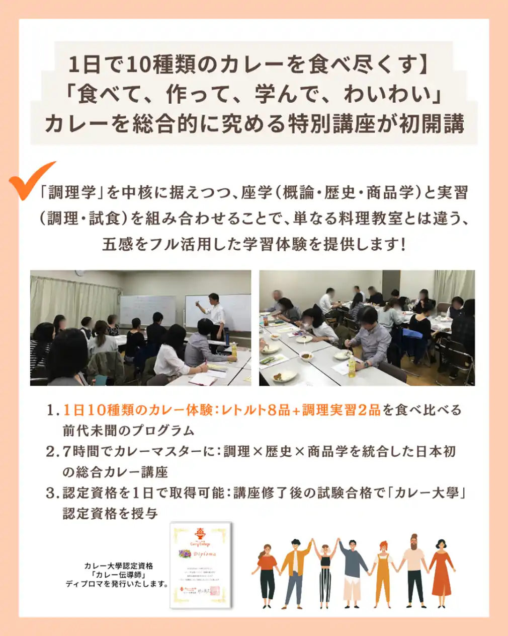 | 【3つの注目ポイント】1.10種類以上のカレー実習&試食の体験する前代未聞のプログラム、2.7時間でカレー専門家になる調理×歴史×商品学を統合した総合カレー講座、3.認定資格「カレー伝導師」を1日で取得可能 |