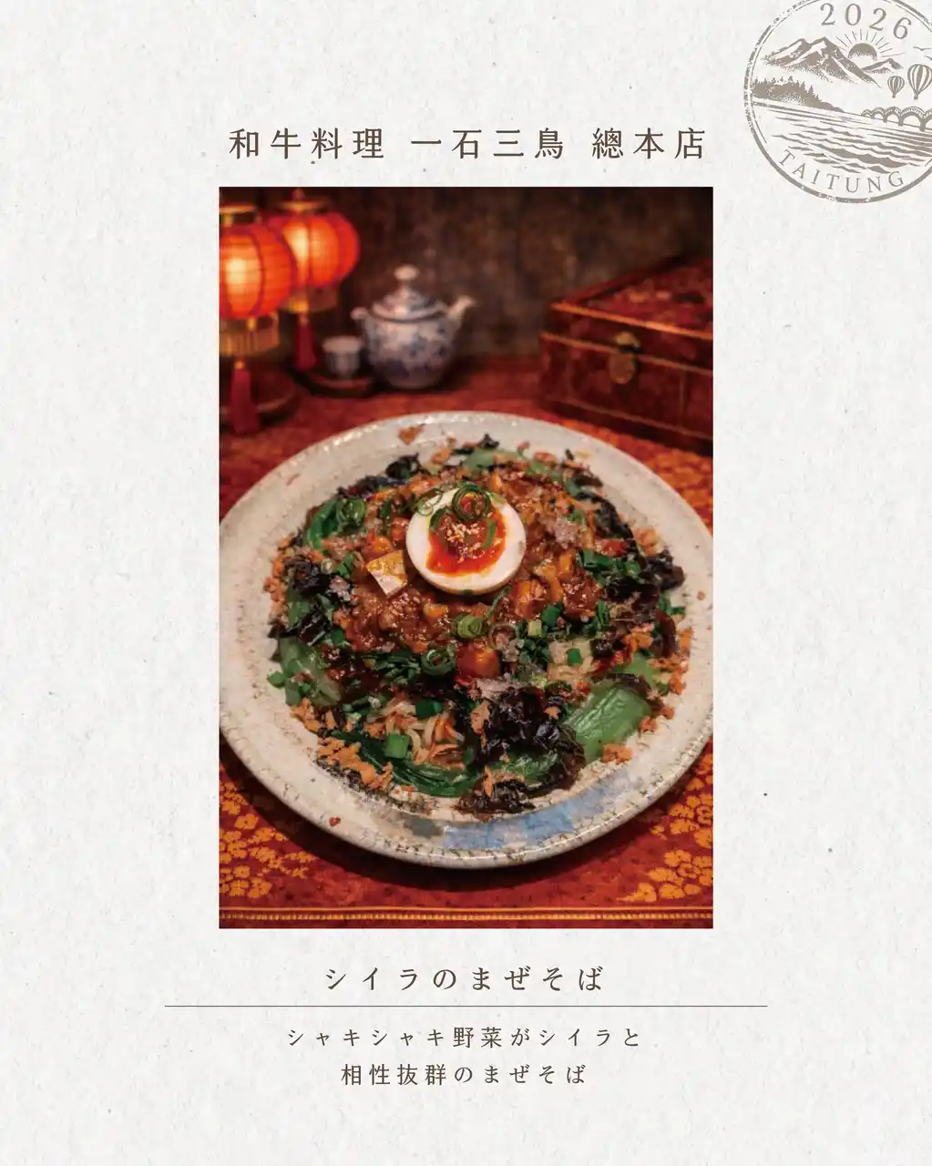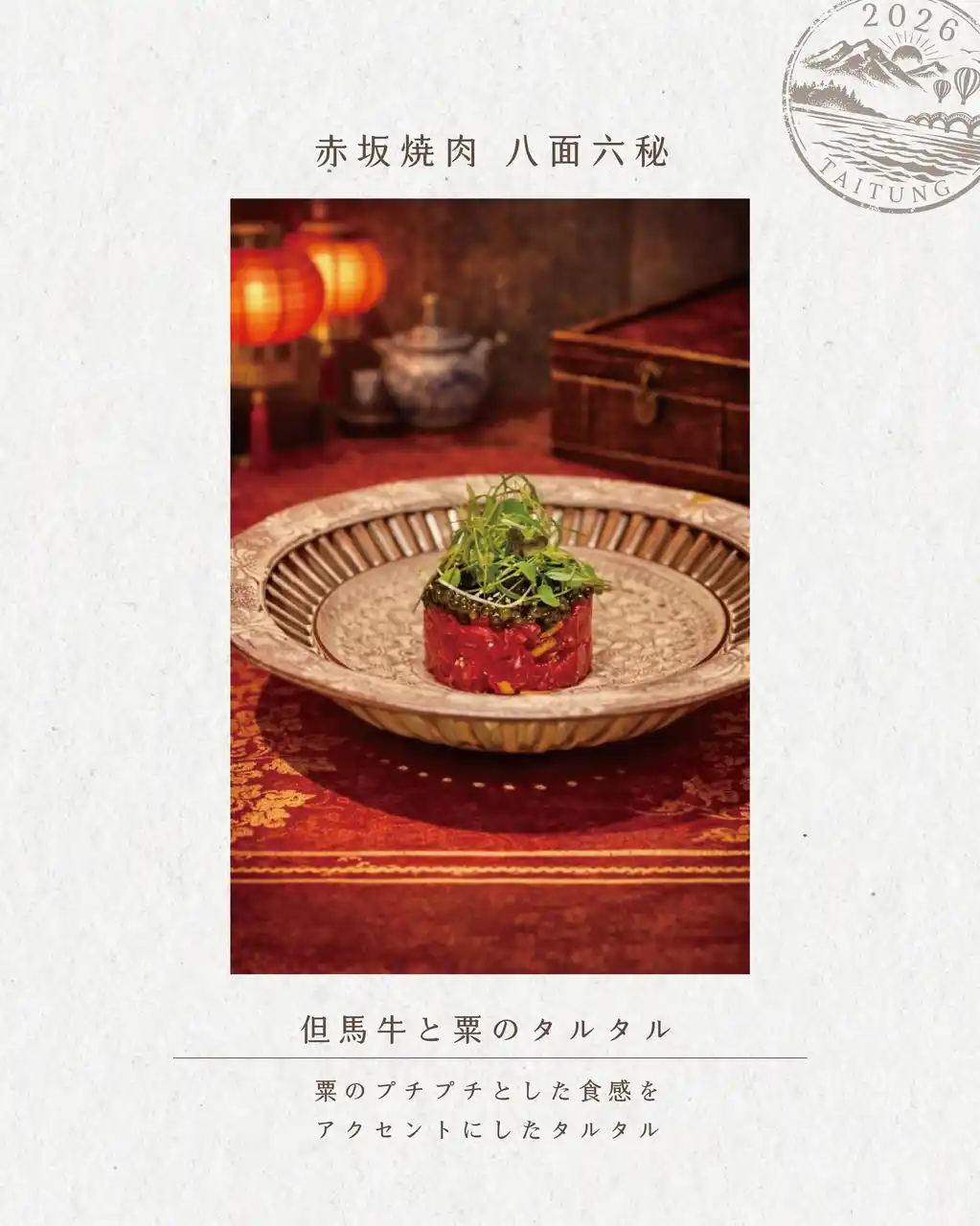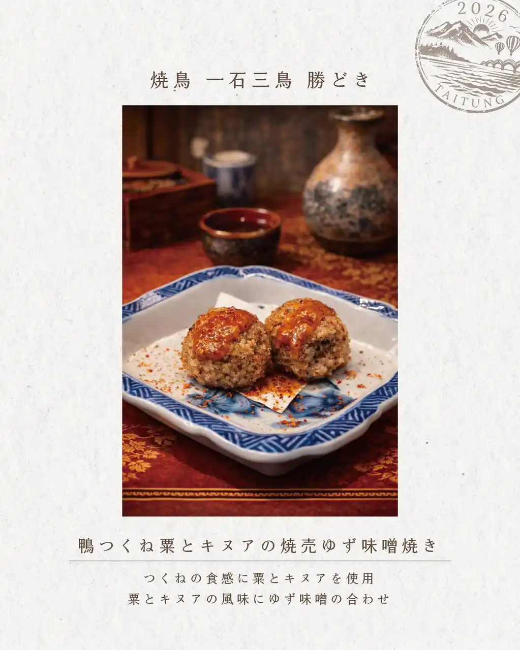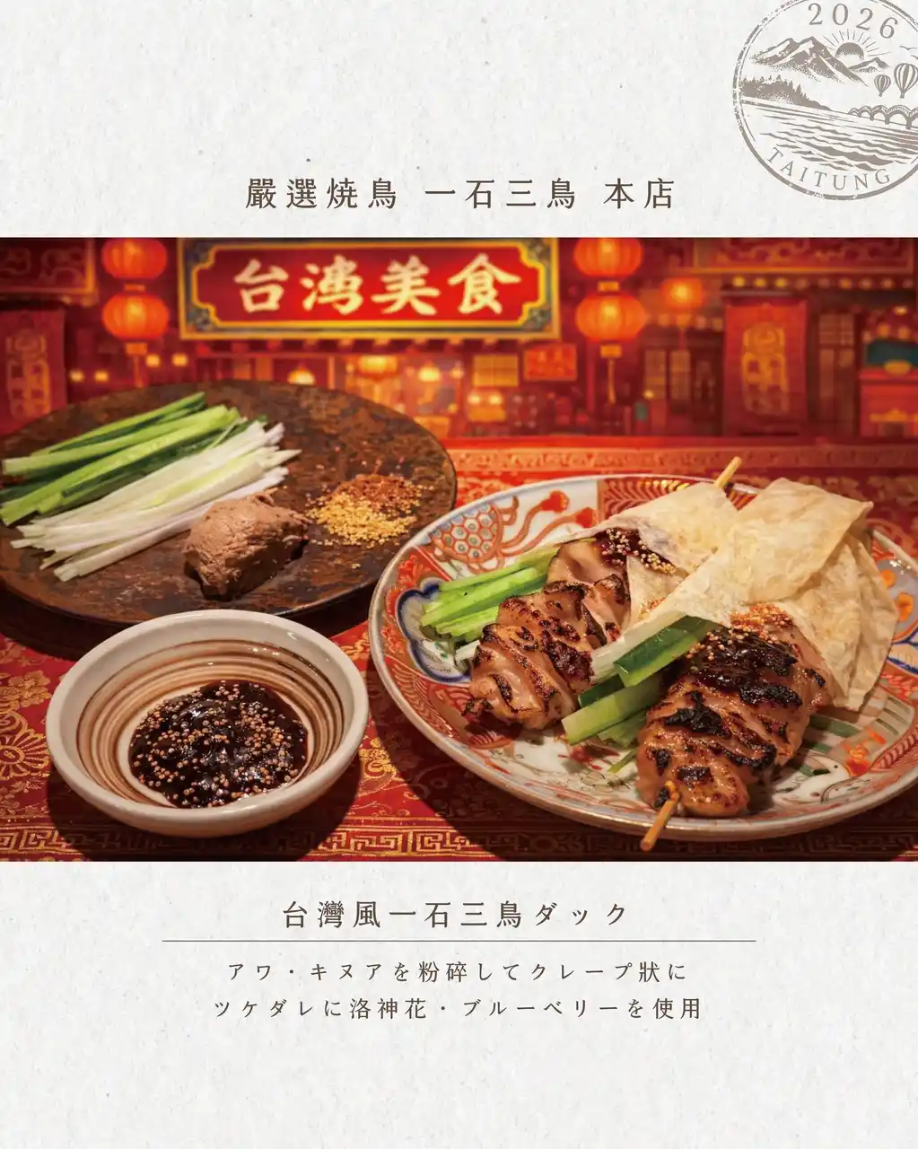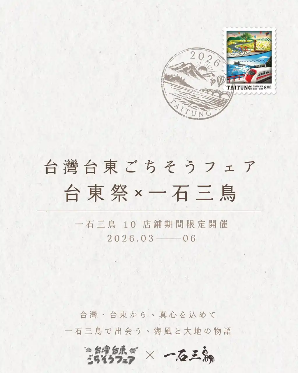 一石三鳥グループは、台湾・台東県の豊かな食材を使用した期間限定フェア「台東祭」を、2026年3月14日(土)から6月13日(土)まで開催。東京・京都・大阪の計10店舗にて、台東の魅力を表現した特別メニューを提供いたします。 |