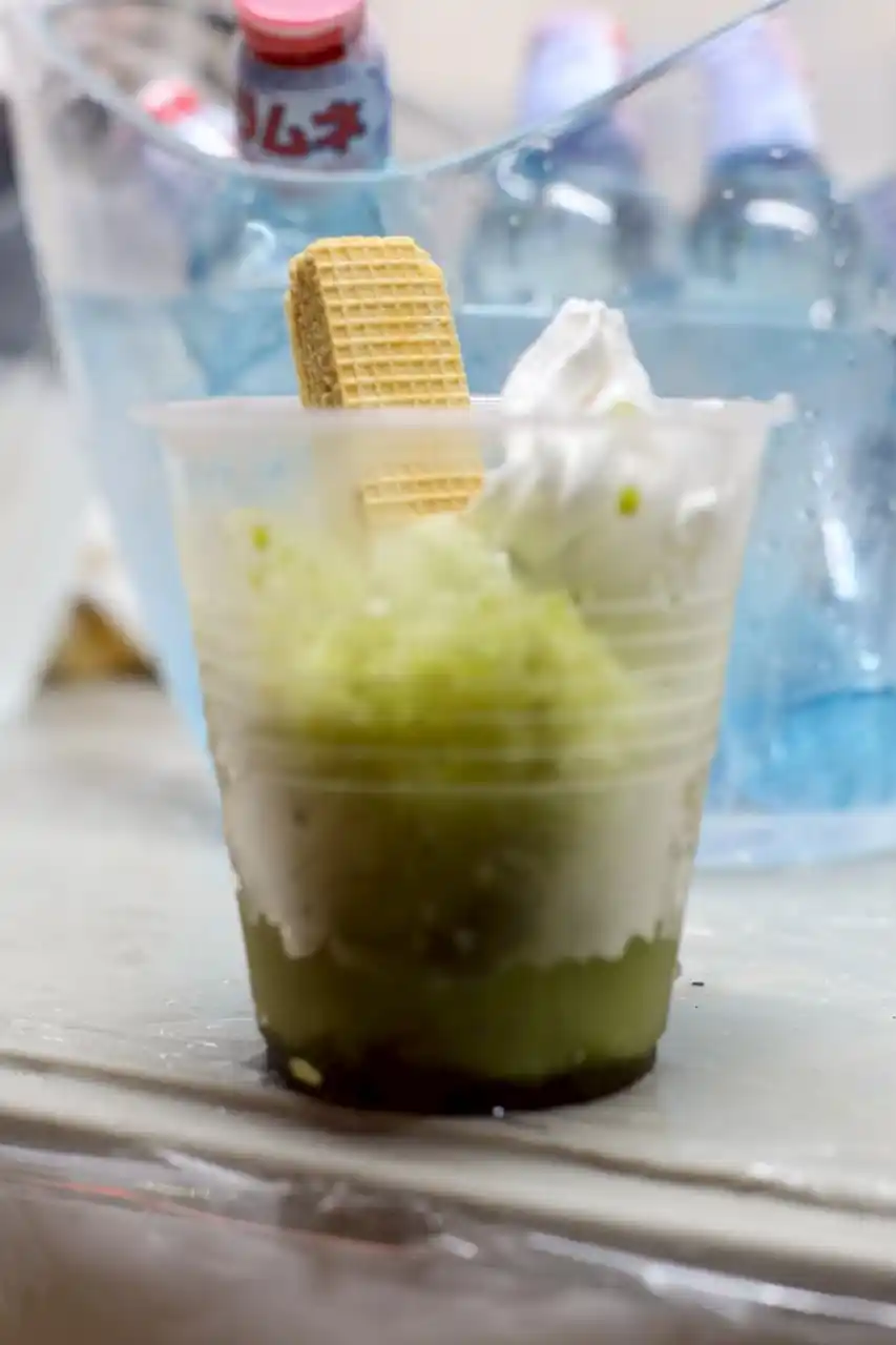 冷茶は、過去に「茶の君野園」とコラボしてパッケージを作成した際にも使用した八女茶を使用した。抹茶かき氷は、子供でも食べられるよう抹茶の渋みと甘みをうまく組み合わせることを意識し、練乳やビスケットなど甘くできる要素を取り入れた。 |