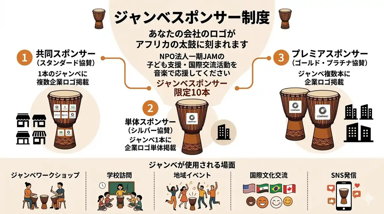| このたび当団体では、地域活動と国際交流活動を支える新たな取り組みとして、企業・団体の皆さまと共に社会活動を広げていく「企業パートナー制度」を開始しました。あわせて、活動で使用するアフリカの太鼓「ジャンベ」に企業ロゴを掲載する「ジャンベスポンサー制度(限定10社)」の募集もスタートしました。 | |||||||||||||||||||