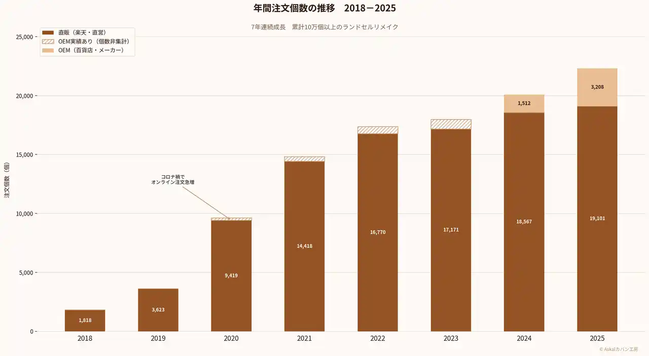 なぜ7年間、一度も前年を下回らなかったのか。理由は値引きでもキャンペーンでもありません。ランドセルリメイクは、完成品が家に届いた瞬間から口コミが始まります。完成品を見た兄弟が「私も絶対リメイクしたい」と言い、ランドセルを大切に扱い続ける。手紙を書いたお母さんが友人に話し、その友人が次の春に注文する。職人の顔が見えるから信頼され、信頼されるから選ばれ続ける。そして毎年3月、卒業シーズンを迎えるたびに新しいお客様が生まれる。注文が注文を呼ぶ構造が、Askalの成長を7年間支え続けてきました。 |