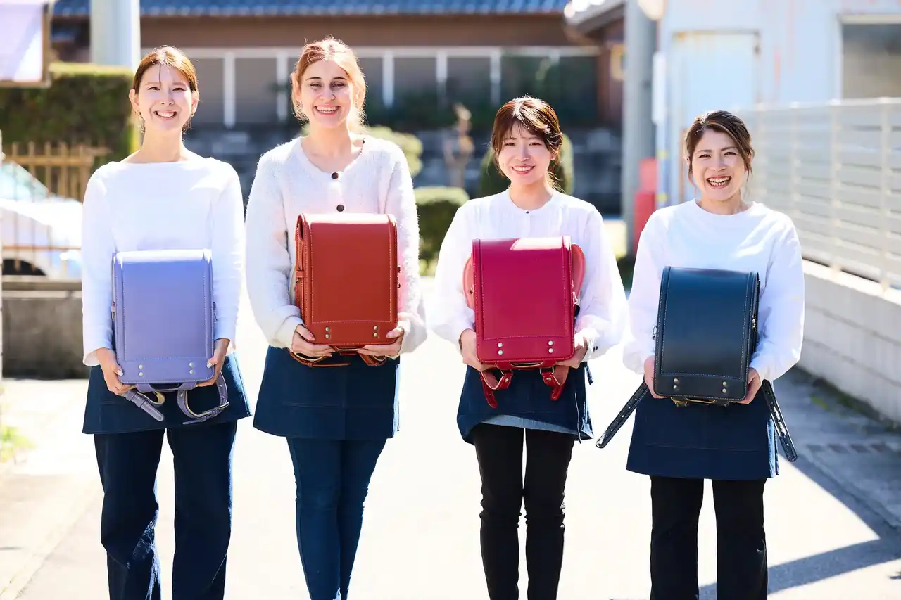▲ Askalカバン工房の職人たち。ランドセルを大切に抱えて。 |