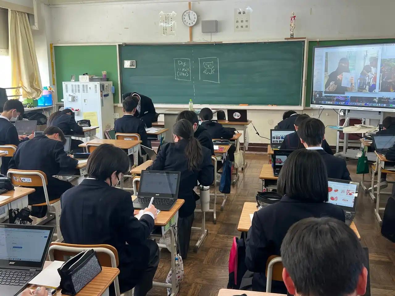 「それぞれが1ページずつ担当し、どんな絵がよいかを一人一人が一生懸命に考えていました。タブレット端末を使い、調べたことを自分なりにアレンジして仕上げました。絵が得意な生徒もいれば不得意な生徒もいますが、それぞれの思いを込めた作品になったと思います。世界がつながる経験は子どもたちの視野を広げ、今後の成長にもつながると感じました。」 |