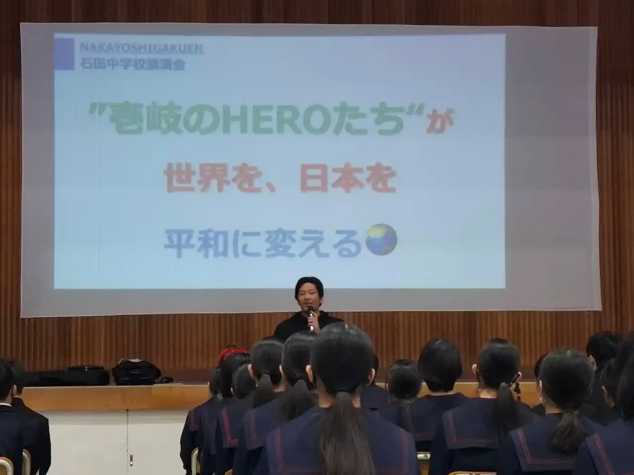 また、講話の中では、生徒たちが近くの人とディスカッションをしながら、『あなたはHEROを見たことがありますか』『自分が本当に辛い時、どうやって希望を持ちますか』『これからの人生で喜ばせたい、笑顔にしたい人はどんな人ですか』といった問いに向き合いました。『どの答え(考え)も正解です。』『誰かが喜べば正解です。』『僕は世界中の80億人の人に笑顔になってほしい。』という言葉が、生徒たちに希望と勇気を与えてくれました。新しいHEROたちの誕生を期待しています。」 |
