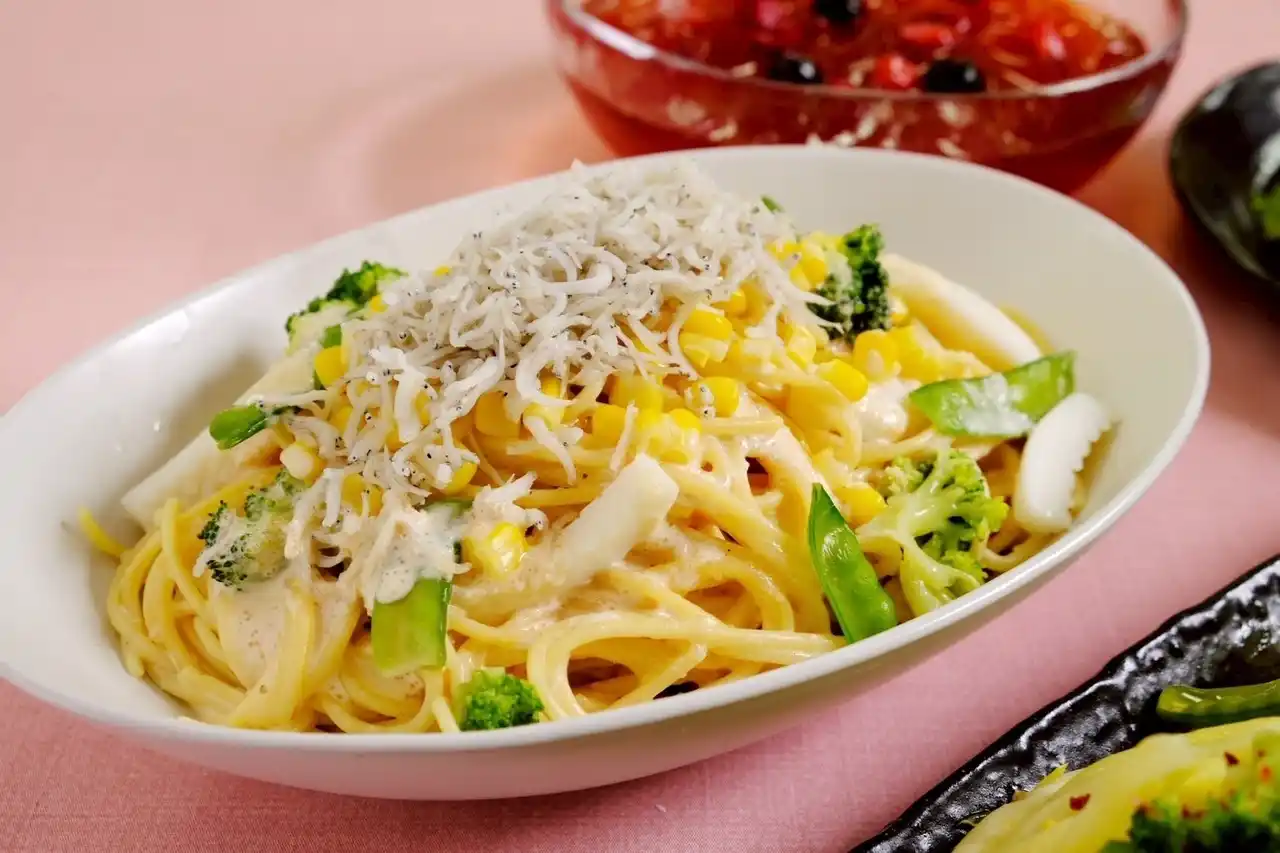 | しらすの旨みと、やわらかな食感のイカを合わせ、明太子とチーズのコク深いクリームソースで仕上げた贅沢なパスタです。 | |||||||||