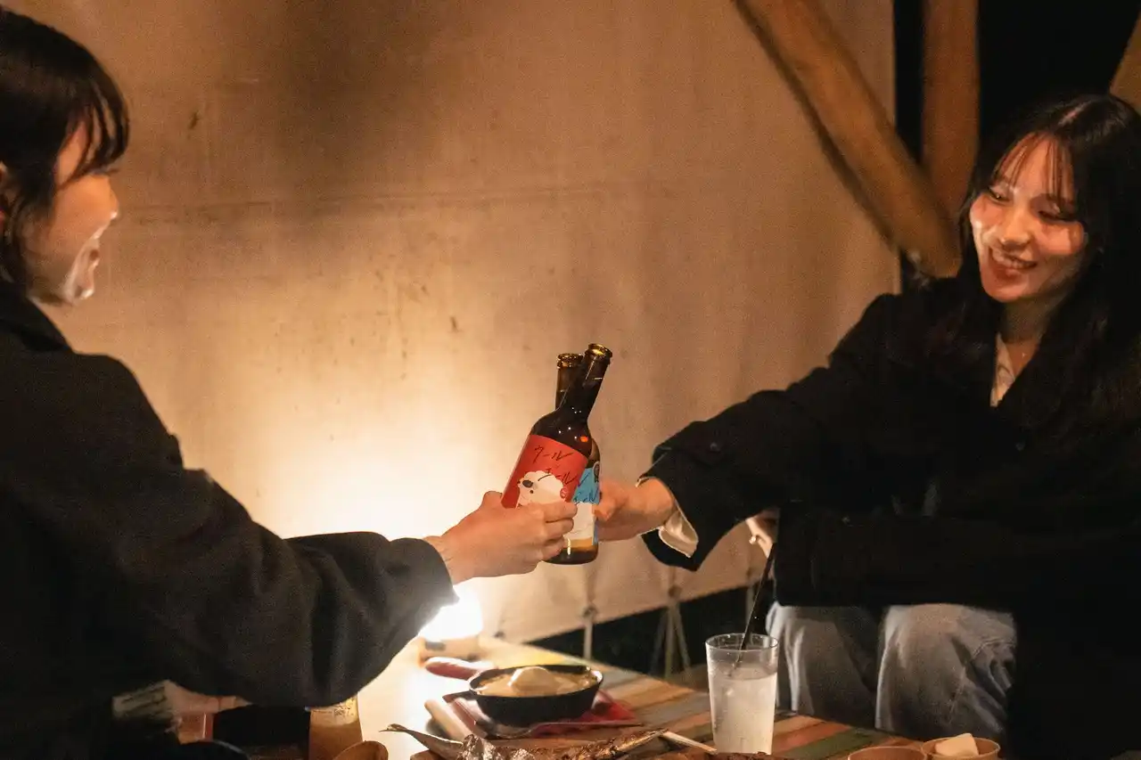 さらに、日帰り利用に加えて宿泊グランピングまで組み合わせることで、交流の時間をよりゆったりと設計できます。宿泊棟は全室にバスタブ、シャワートイレ、化粧室、冷蔵庫、エアコンを完備し、全室プロジェクター付き。加えて、食事・ドリンク・アクティビティが含まれるオールインクルーシブスタイルを採用しており、宿泊者専用ラウンジではアルコール飲み放題やおやつも楽しめます。研修後の懇親や、部署を超えたコミュニケーションの場としても活用しやすい環境です。 |