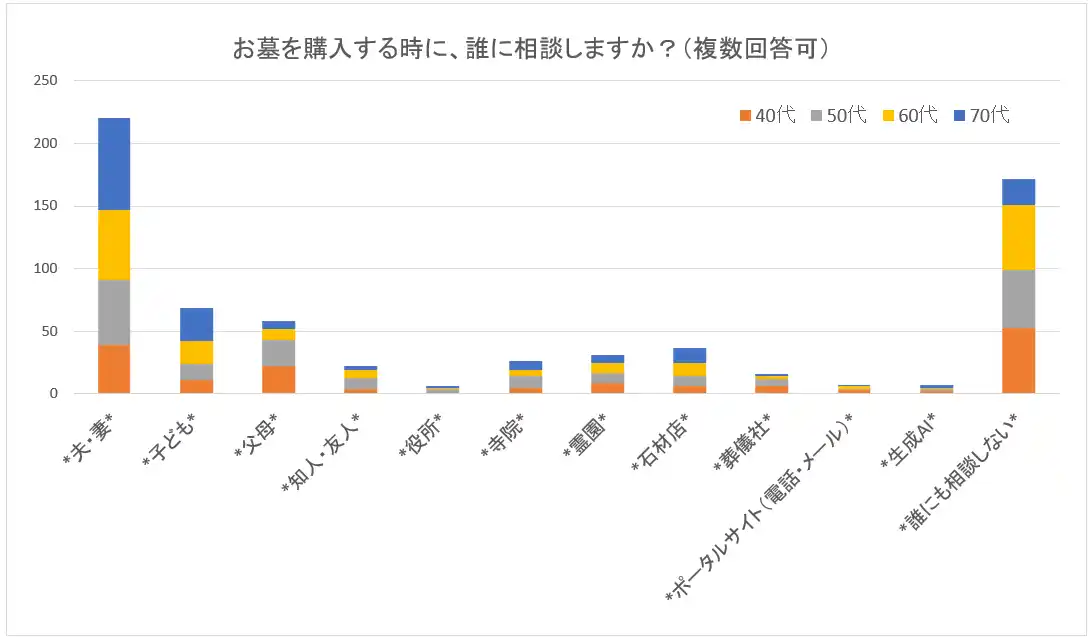 配偶者が最重要相談相手。一方で約3割が「誰にも相談しない」と回答しており、自己判断傾向も見られる。 |