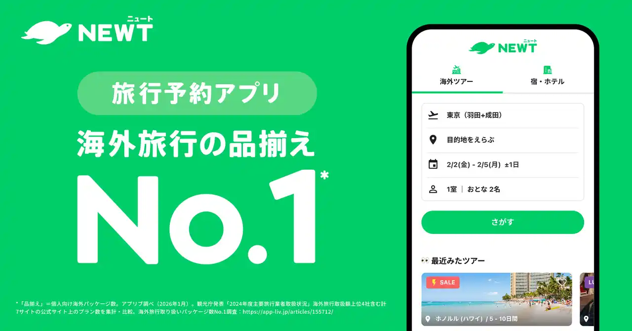 株式会社令和トラベル(本社:東京都渋谷区、代表取締役:篠塚 孝哉)が運営する、かしこい、おトク、旅行アプリ『NEWT(ニュート)』は、スマホアプリ情報メディア「アプリブ」を運営するナイル株式会社の調査において、主要旅行予約サイトの海外旅行取り扱いパッケージ数を比較した結果、海外旅行の品揃えNo.1を獲得したことをお知らせいたします。 |