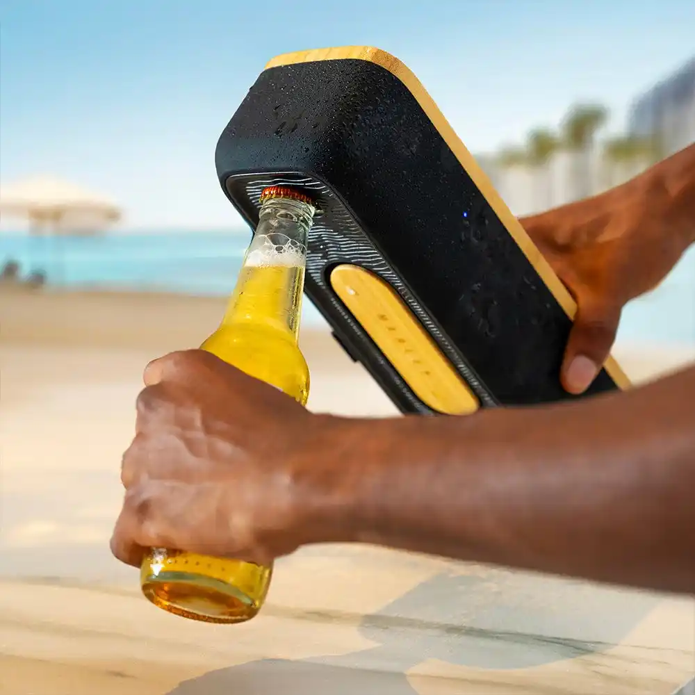内蔵ボトルオープナーは、実用性とスタイリッシュさを兼ね備えたデザイン。旅先や、パーティー、アウトドアでの集まりでも、このさりげない機能があればスマートに楽しめます。機能性と利便性、そしてモダンな上質感を大切にする人に向けて設計されたこのスピーカーは、日々のライフスタイルに自然と溶け込みます。 |