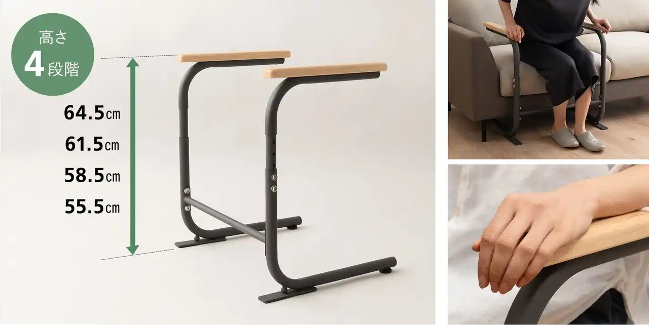肘掛けの高さは約55.5~64.5cmの範囲で、4段階に調節できます。ソファの座面高やご使用者の体格に合わせて最適な高さに設定でき、無理のない姿勢で安定した立ち上がりを支えます。 |