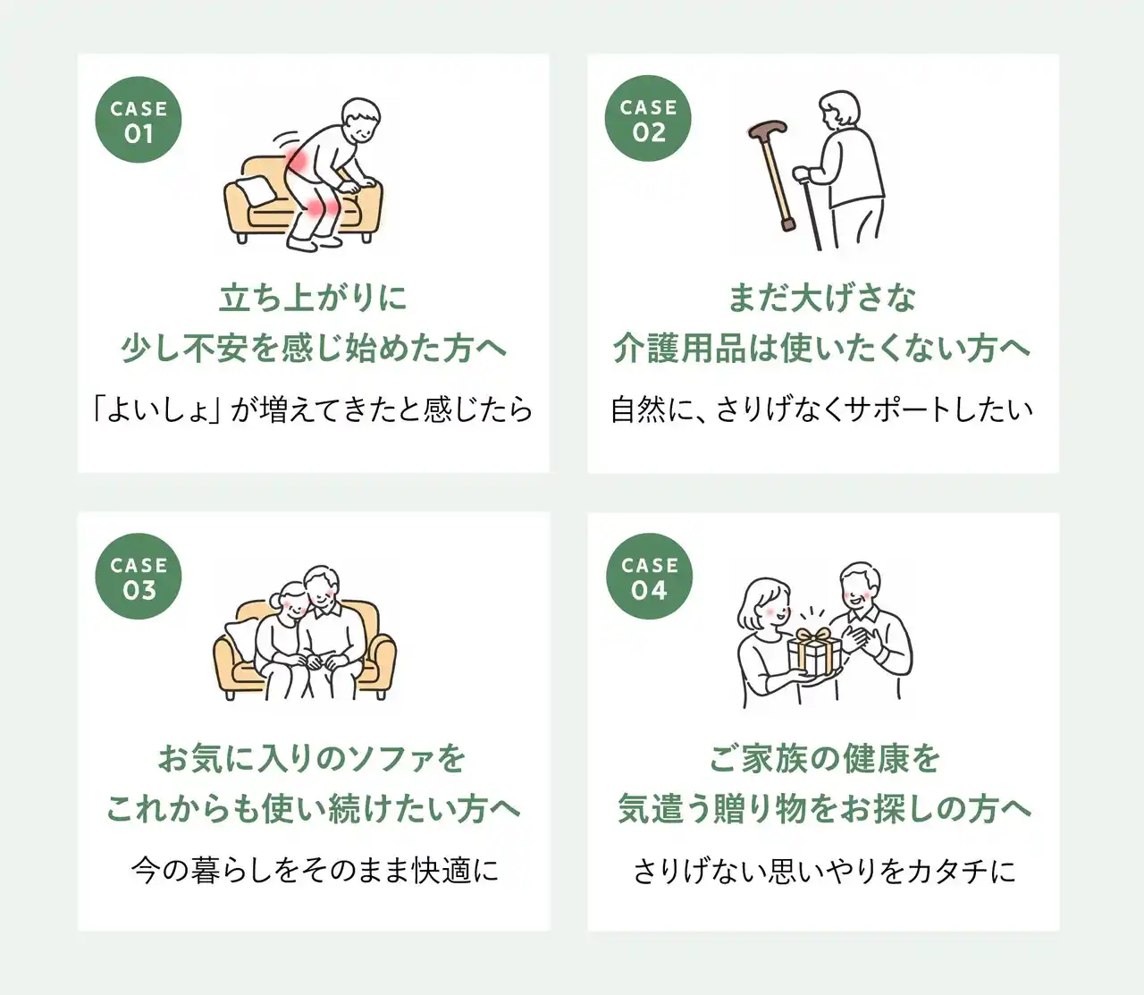 本商品は、ソファからの立ち上がりに不安を感じ始めた方や、「よいしょ」という声が増えてきたと感じる方におすすめです。 |