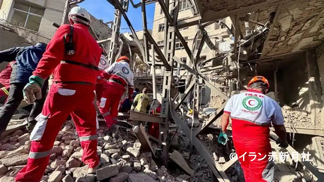 約400万人のボランティアと10万人の緊急対応要員からなる全国的なネットワークを活用し、医療・緊急対応をはじめとする救援活動を行っています。南部のミナブ(ホルモズガーン州)では、学校が攻撃による被害を受けたことから、対応チームを派遣したほか、イラン各地で、救急医療の提供、救援物資の配布、捜索・救助活動などを行っています。 |