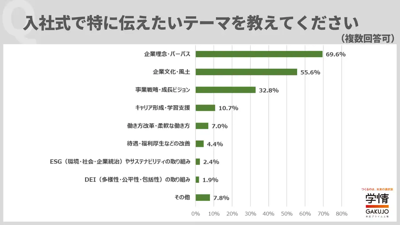 株式会社学情(本社:東京都中央区)は、企業・団体の人事担当者を対象に、「入社式」に関するインターネットアンケートを実施しました。入社式で特に伝えたいテーマは、「企業理念・パーパス」が69.6%で最多で、「企業文化・風土」55.6%が続きました。