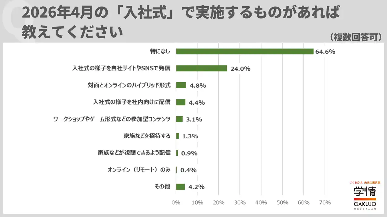 入社式の位置づけは、「儀式・セレモニー」が63.8%で最多ですが、「新入社員のエンゲージメント向上のためのイベント」20.6%、「研修・オンボーディング(組織への定着・戦力化)の一部」も11.1%で、3割超の企業が新入社員の定着などに向けた内容を意識しています。「定着の要素が一番強い。役員や社員の話を聞いてもらいモチベーションアップを図る」「『この会社で長く働きたい』と思ってもらうきっかけに」といった声が寄せられました。今年の入社式で実施するものでは、「入社式の様子を自社サイトやSNSで配信」との回答が24.0%に。具体的には「学生への情報提供」「次年度以降の就活生に社内の様子をアピール」など採用広報のために実施する企業も多いことが分かりました。 |