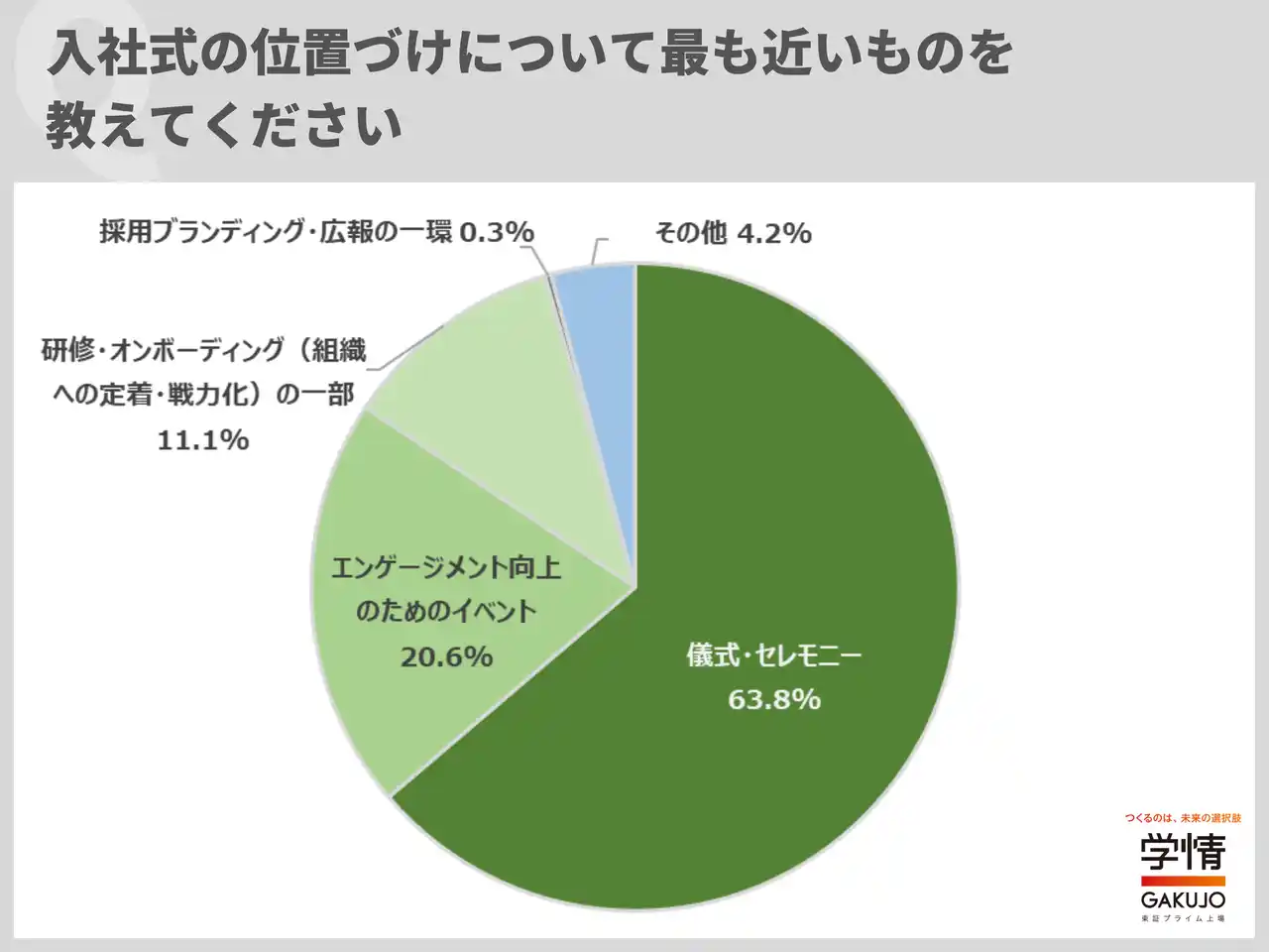 入社式の位置づけは、「儀式・セレモニー」が63.8%で最多でしたが、「新入社員のエンゲージメント向上のためのイベント」が20.6%、「研修・オンボーディング(組織への定着・戦力化)の一部」も11.1%で、3割を超す企業が単なる儀式ではなく、新入社員の定着などに向けた内容を意識していることが分かりました。 |
