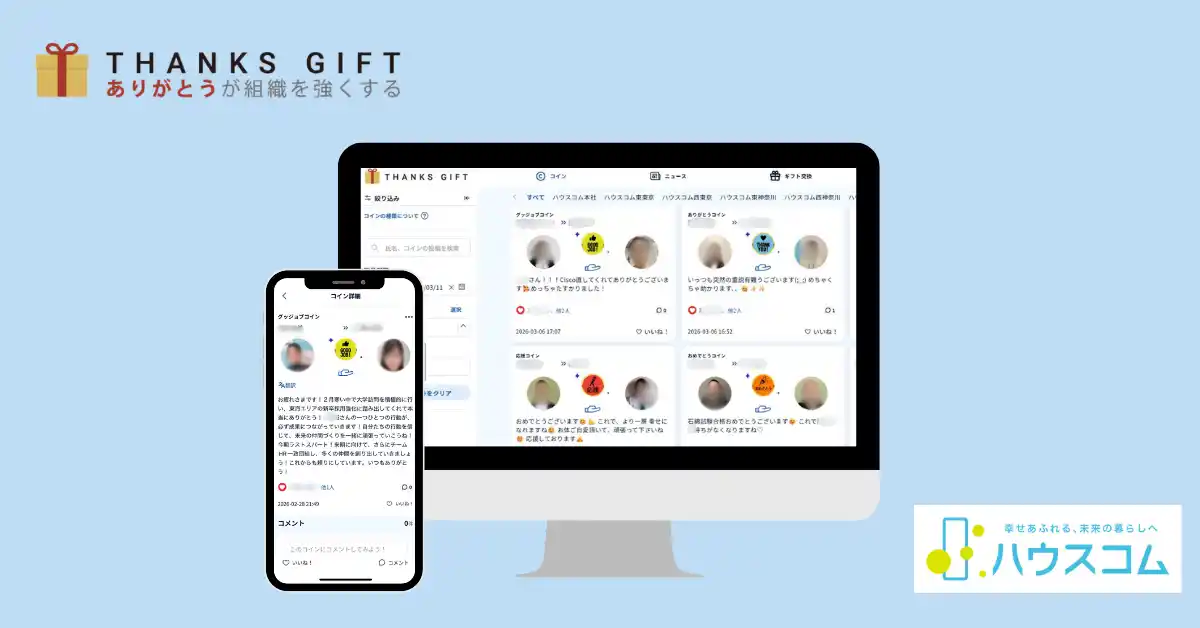ハウスコムは2024年9月より、従業員同士が日々の感謝や応援の気持ちをコインとして贈り合う社内コミュニケーションプラットフォーム「THANKS GIFT」を導入しています。現在、全国240店舗以上、約1,200名の従業員が利用しており、利用率はほぼ100%、稼働率は直近の2月時点で74%と、多くの従業員に日常的に活用されています。 |
