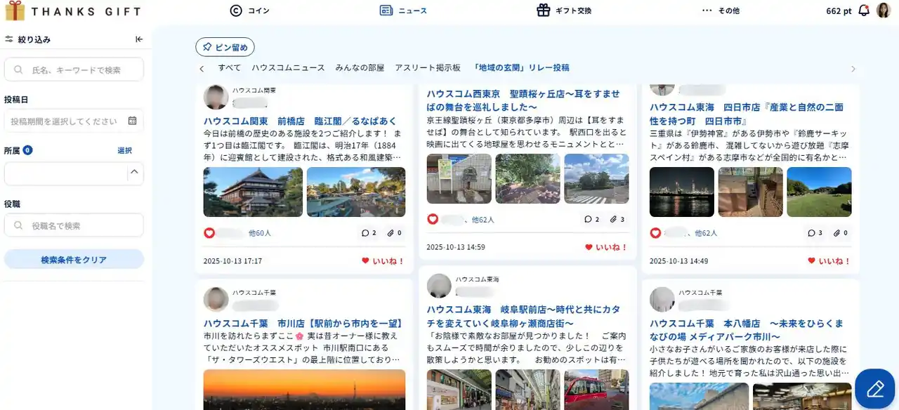 また、導入時から現在までに従業員同士で贈り合ったコインの総流通量は約5.6万件にのぼり、従業員数から試算すると1人あたり平均約50回の感謝が社内でやり取りされています。さらに、掲示板の投稿数は累計618件(2026年3月12日現在)となり、1年前と比べて約5倍に増加しています。 |
