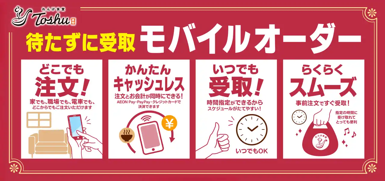 中華料理店「れんげ食堂Toshu」を展開するイオングループのオリジン東秀株式会社(本社:東京都調布市)は、2026年3月16日(月)より、「れんげ食堂Toshu」にてモバイルオーダーサービスを開始いたします。 |