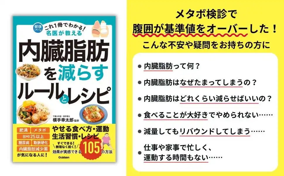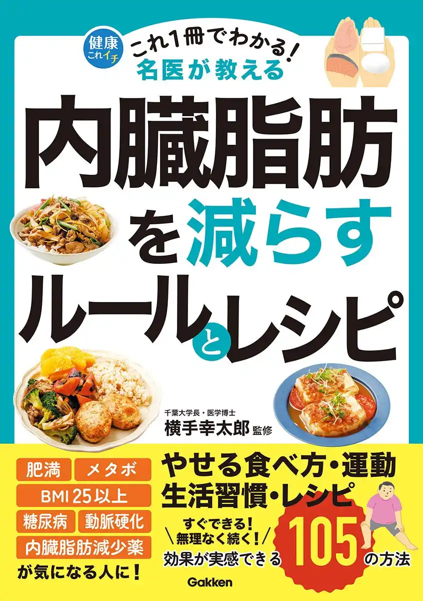 『これ1冊でわかる! 名医が教える 内臓脂肪を減らすルールとレシピ』は、千葉大学長・医学博士の横手幸太郎先生が監修。脂質異常症や糖尿病の名医が、内臓脂肪や肥満症予防に関する知識を、図解を交えて105の方法でわかりやすく解説しています。 |