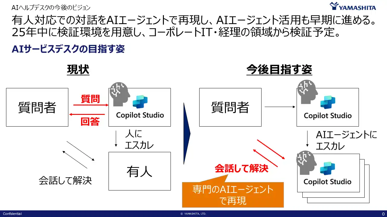 介護用品(福祉用具)レンタル・販売事業および、リネンサプライ事業を行う株式会社ヤマシタ(本社:静岡県島田市、代表取締役社長:山下和洋、以下「ヤマシタ」)は、社内からの各種問い合わせに対応する社内問い合わせ対応AIチャットボット「ヤマシタAIヘルプデスク」を内製で開発し、2026年2月より運用を開始したことをお知らせします。なお、本AIエージェントの開発にはMicrosoft Copilot Studio を活用しています。 |