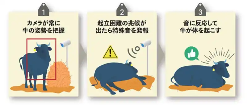起立困難により牛を失った場合の経済的損失を防ぐだけでなく、牛舎見回りにかかる肉体的・精神的な負荷の軽減に加え、非接触型で牛にストレスを与えないアニマルウェルフェアを実現するものです。 サービスURL:https://www.ntt-tx.co.jp/products/bujidas/