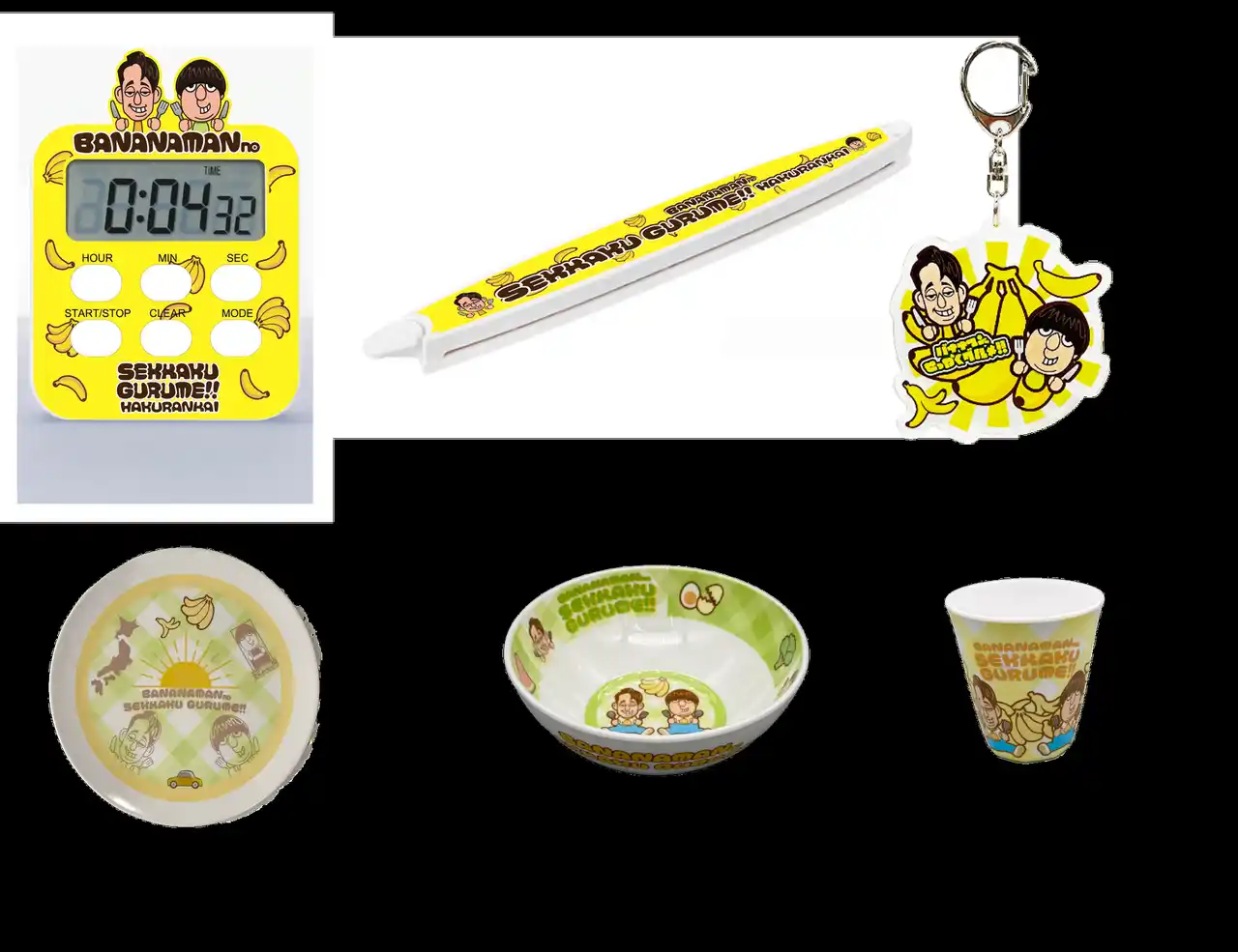 上段左)キッチンタイマー 1,980円 上段中)マグネット付きフードクリップ 770円 上段右)アクリルキーホルダー(バナナVer) 800円 下段左から)メラミンプレート・メラミンボウル・メラミンコップ 各1,430円 |
