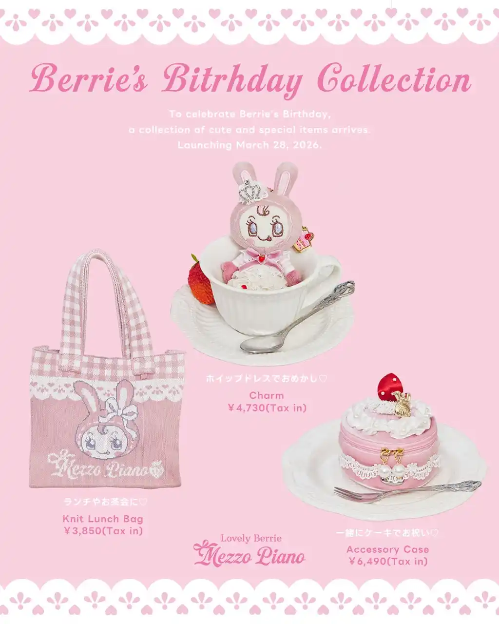 株式会社ナルミヤ・インターナショナル(本社:東京都港区、代表取締役社長執行役員:保坂 大輔)が展開するブランド「mezzo piano junior(メゾピアノジュニア)」は、ブランドの人気キャラクター「ベリエちゃん」のお誕生日を記念したスペシャルコレクション「Lovely Berie Birthday Collection」を、2026年3月28日(土)より発売いたします。 |