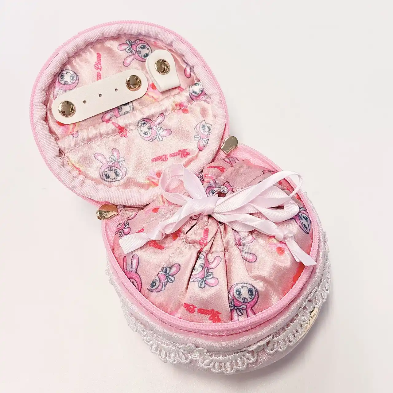 ケースを開けると、中には今回のオリジナル柄が広がり、ネックレスやピアスを整理できる巾着タイプの収納付き。お気に入りのアクセサリーを大切にしまえるのはもちろん、お部屋に飾ればときめきいっぱいのインテリアとしても楽しめます。思わず写真を撮りたくなる、特別なアイテムです。 |