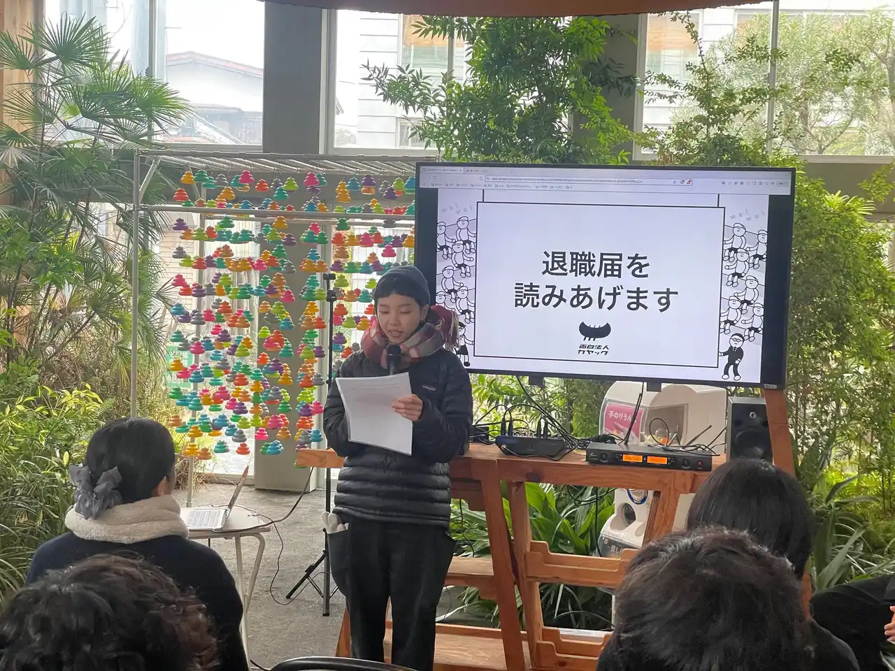 新入社員代表挨拶として「退職届」を読み上げる、カヤック恒例の入社式 |