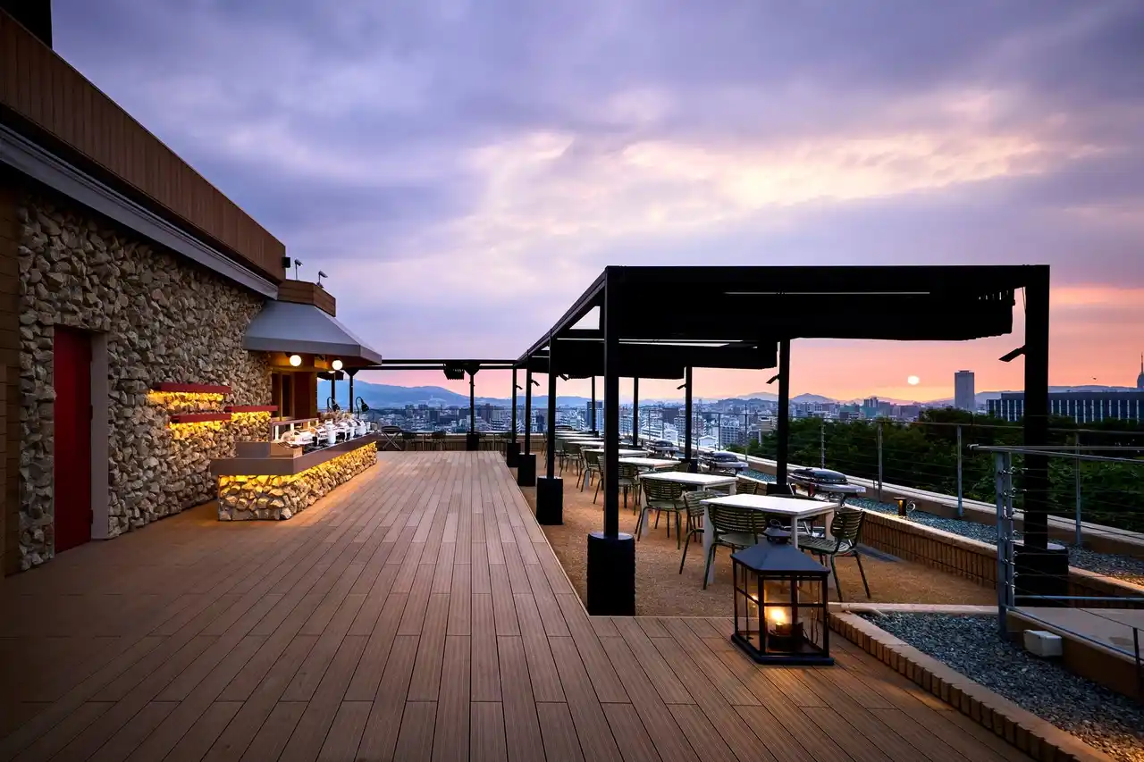 2025年にリニューアルオープンした『THE GARDEN BRASSERIE』は、空と風を感じる開放的なテラス空間で食事を楽しめるビアテラスです。ウッドデッキの先には、福岡の街並みと豊かな緑が織りなすパノラマビューが広がり、この場所ならではの開放感に包まれます。足元にはオレンジ色のランタンが温もりを添え、夜には福岡の街を一望するダイナミックな夜景をご堪能いただけます。 |
