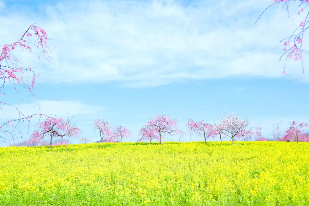 桜のピンク、菜の花の黄色、空の青。3つの春色が広がるエリア(写真は過去の様子) |