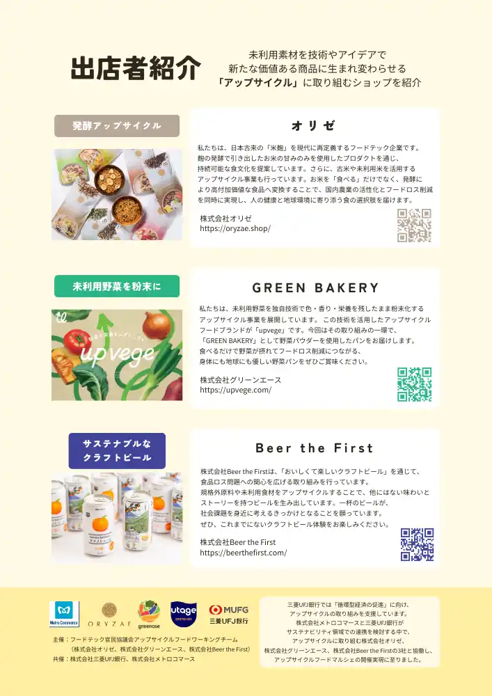 こうした背景を受け、東京メトログループと三菱UFJ銀行がサステナビリティ領域での新たな連携を模索する中で、駅構内の催事スペースに着目した本企画が立案されました。三菱UFJ銀行の呼びかけにより、独自の技術を持つスタートアップ3社(オリゼ、グリーンエース、Beer the First)が賛同し、今回の共同出店が実現。 なお、参加スタートアップ3社と三菱UFJ銀行は、フードテック官民協議会の「アップサイクルフードワーキングチーム」にも参画しており、本取り組みは同施策とも連動しています。 |