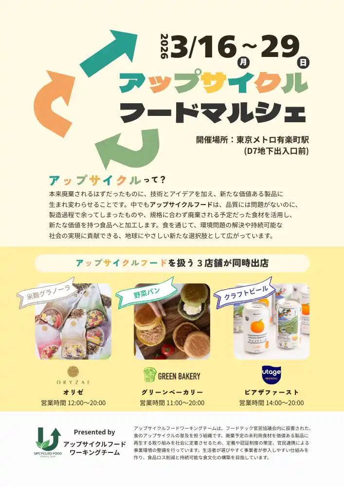 独自の粉末化技術を用いて、未利用野菜のアップサイクルに取り組む株式会社グリーンエース(本社:山形県酒田市、代表取締役:中村慎之祐、以下「グリーンエース」)は、株式会社メトロコマース、株式会社三菱UFJ銀行、株式会社オリゼ、株式会社Beer the Firstと協働し、食の「アップサイクル」普及に向けた取り組みとして、2026年3月16日(月)から3月29日(日)まで、東京メトロ有楽町駅にて期間限定ショップ『アップサイクルフードマルシェ』を開催いたします。 |