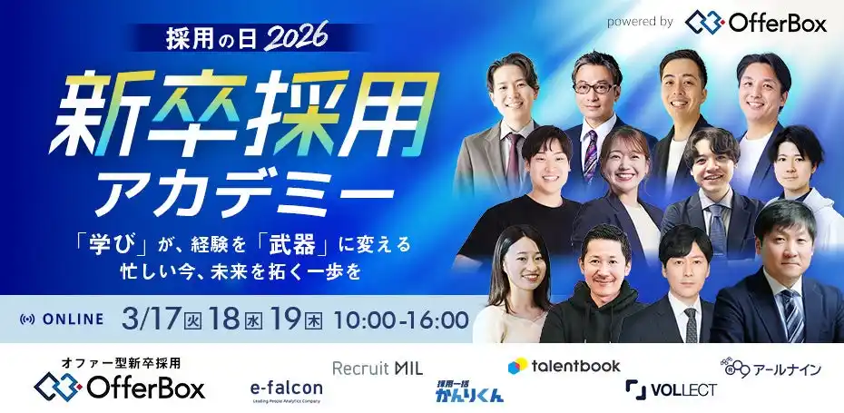 | 本イベントは、2026年3月17日(火)~3月19日(木)の3日間にわたり開催され、新卒採用の最前線で活躍する実務家・専門家による全12講演が実施されます。 | |||