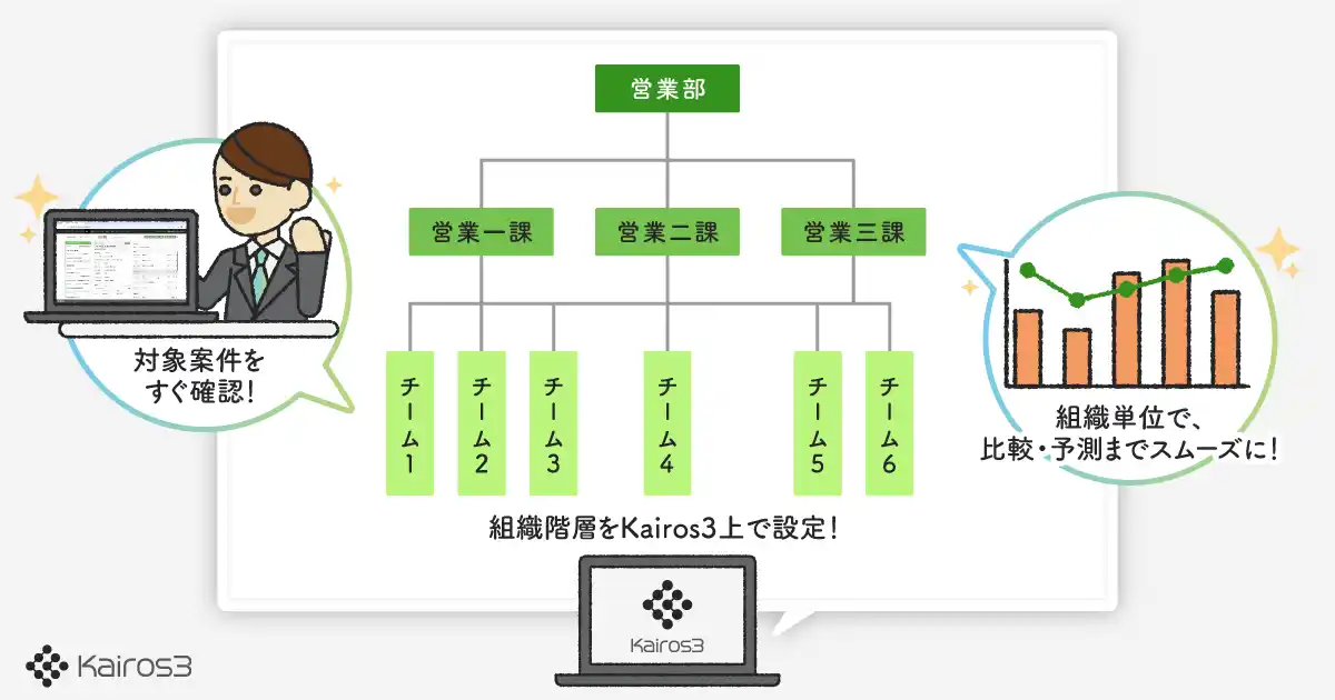 本部・部・課・チームといった複雑な営業組織の階層構造を、「Kairos3」上で再現できるようになりました。 |