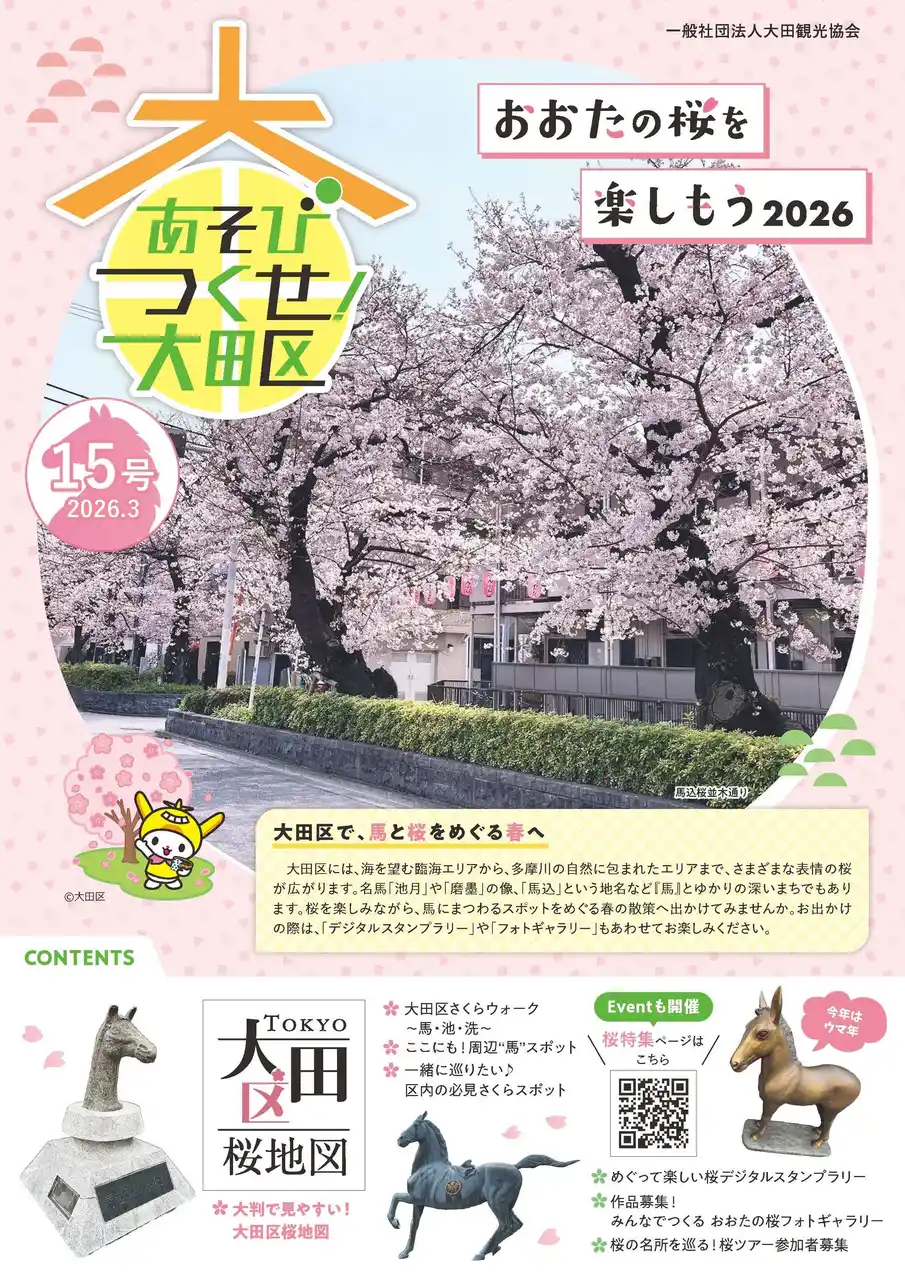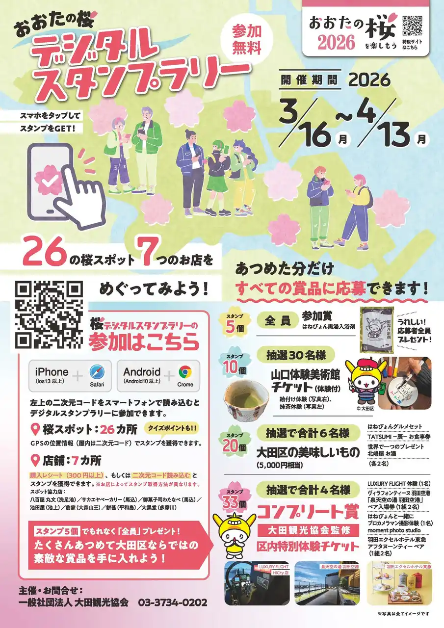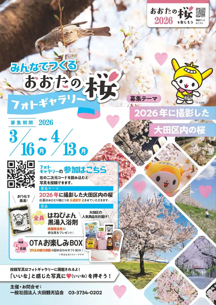 一般社団法人大田観光協会は、今年も「おおたの桜を楽しもう2026」を開催します。区内各所の桜スポットを巡るデジタルスタンプラリーや写真投稿企画など、春を満喫できる多彩なイベントで、おおたの魅力を再発見してください。 |