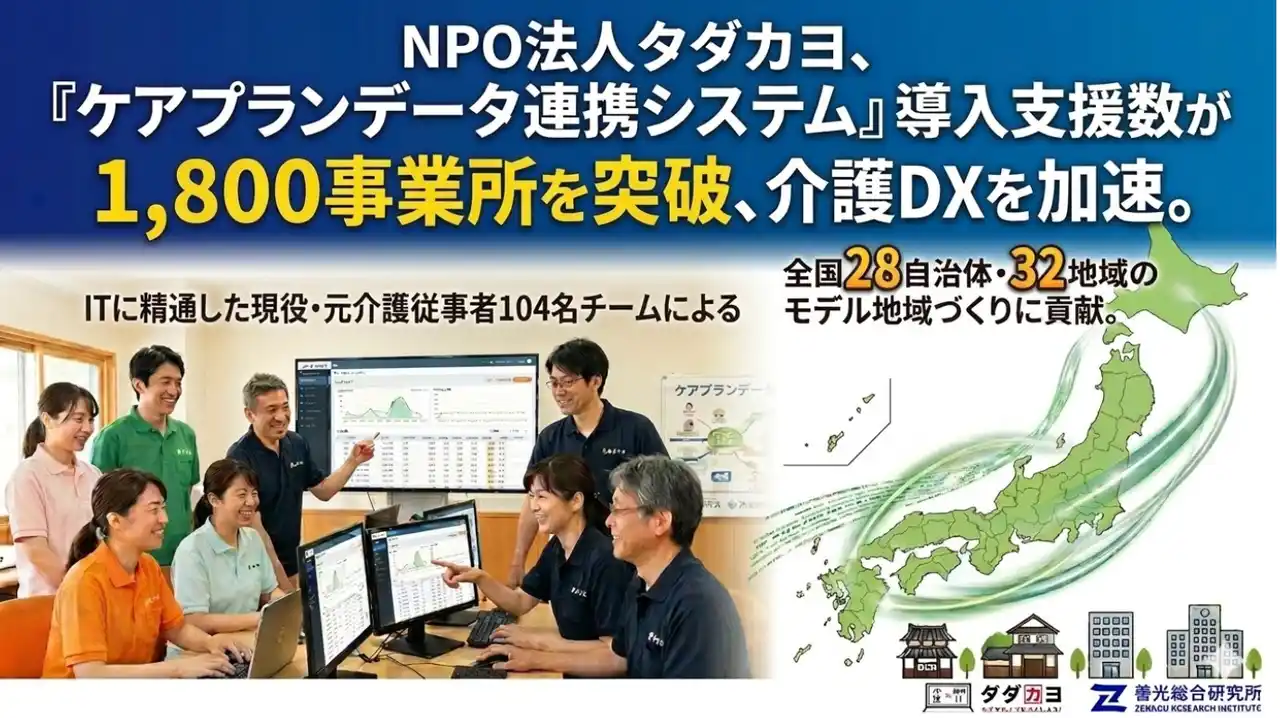 『タダ』で『カ』イゴを『ヨ』クしよう!」をモットーに掲げ、介護現場に無料ICTツールの普及活動を行うNPO法人タダカヨ(以下 タダカヨ)は、令和7年度(2025年度)における「ケアプランデータ連携システム」の導入支援事業所数が、累計で1,800軒を突破したことをお知らせいたします。 |