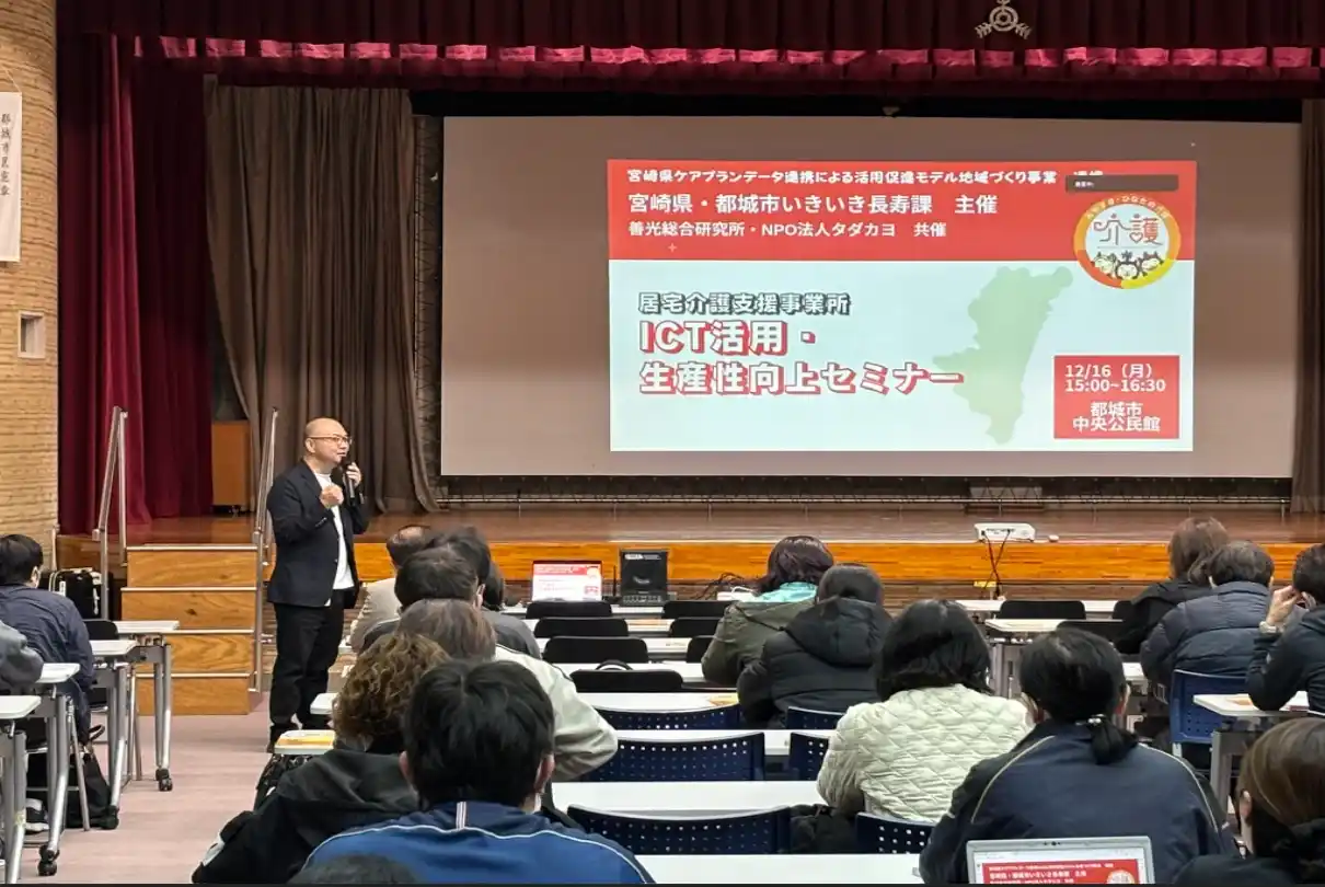 タダカヨは、「現場を知るNPOだからこそできる伴走支援」を掲げ、善光総研と連携して各地の導入支援を受託しています。昨年度、宮崎県都城市では、善光総研のシンクタンクとしての知見と、タダカヨによる現場への直接的なICT活用支援(訪問、電話、遠隔サポート)を組み合わせることで、人口10万人以上の自治体の中でシステム普及率「日本一」を実現しました。 |