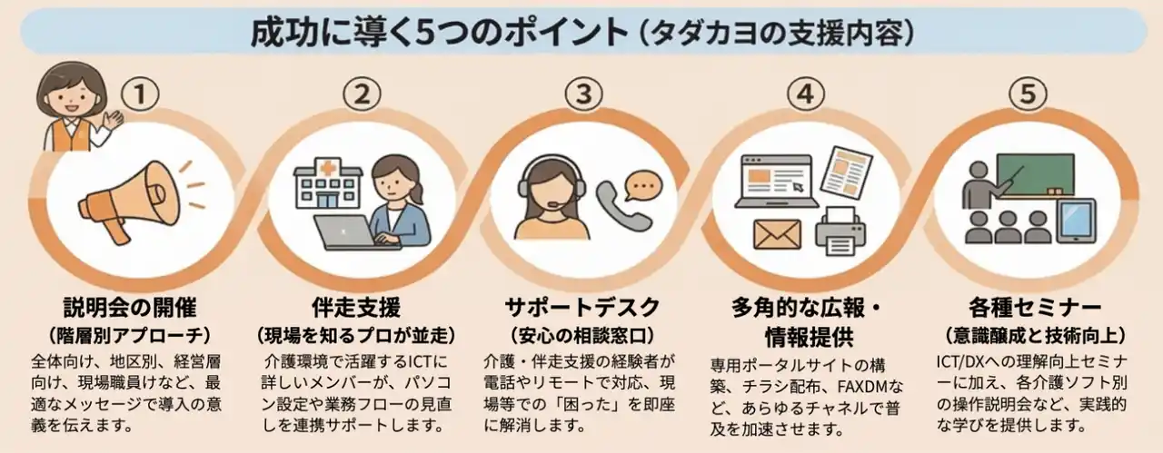 ITに精通した現役・元介護従事者が中心となった支援チームが、現場の目線に立ったきめ細やかなサポートを提供し、地域全体の介護DX推進に貢献しています。 |
