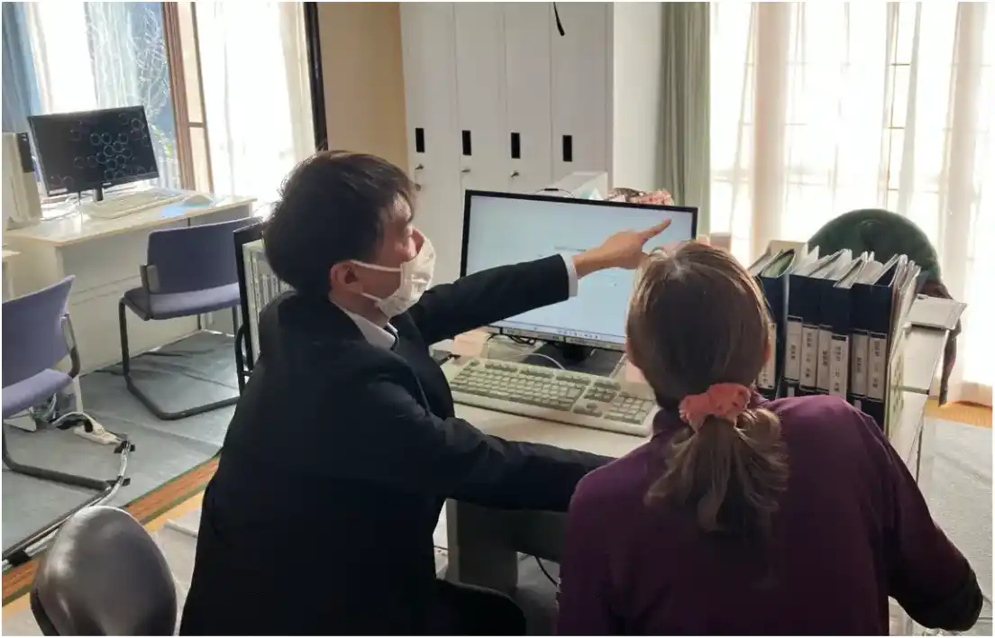事業所への個別訪問サポートの様子。パソコン画面を見ながらマンツーマンで操作説明。 |